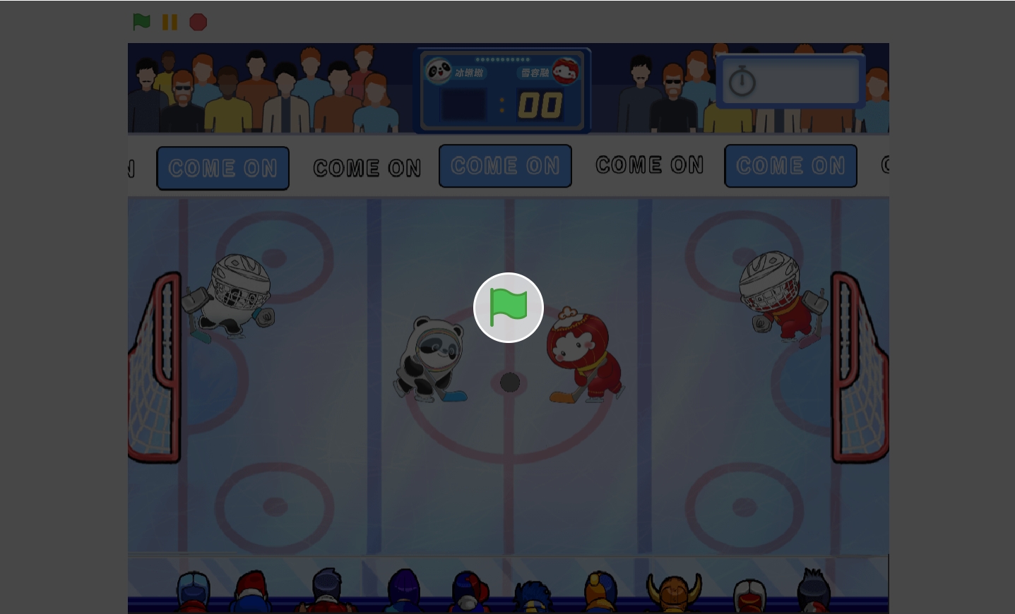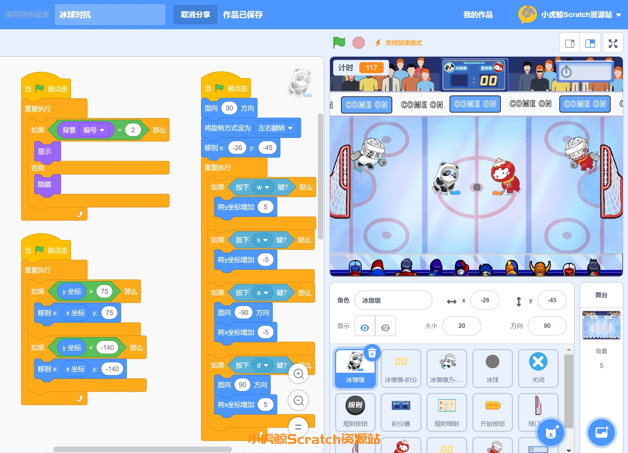 “冰球对抗赛”是一个基于Scratch编程平台的冰球游戏。在这个游戏中,小朋友们将分别控制冰墩墩和雪容融两个角色,在冰球场地上展开一场激烈的对抗。通过方向键和AWSD键,小朋友们可以控制角色的移动,而按下空格和O键则可以发射冰球。在规定的时间内,得分多的一方将获得胜利。