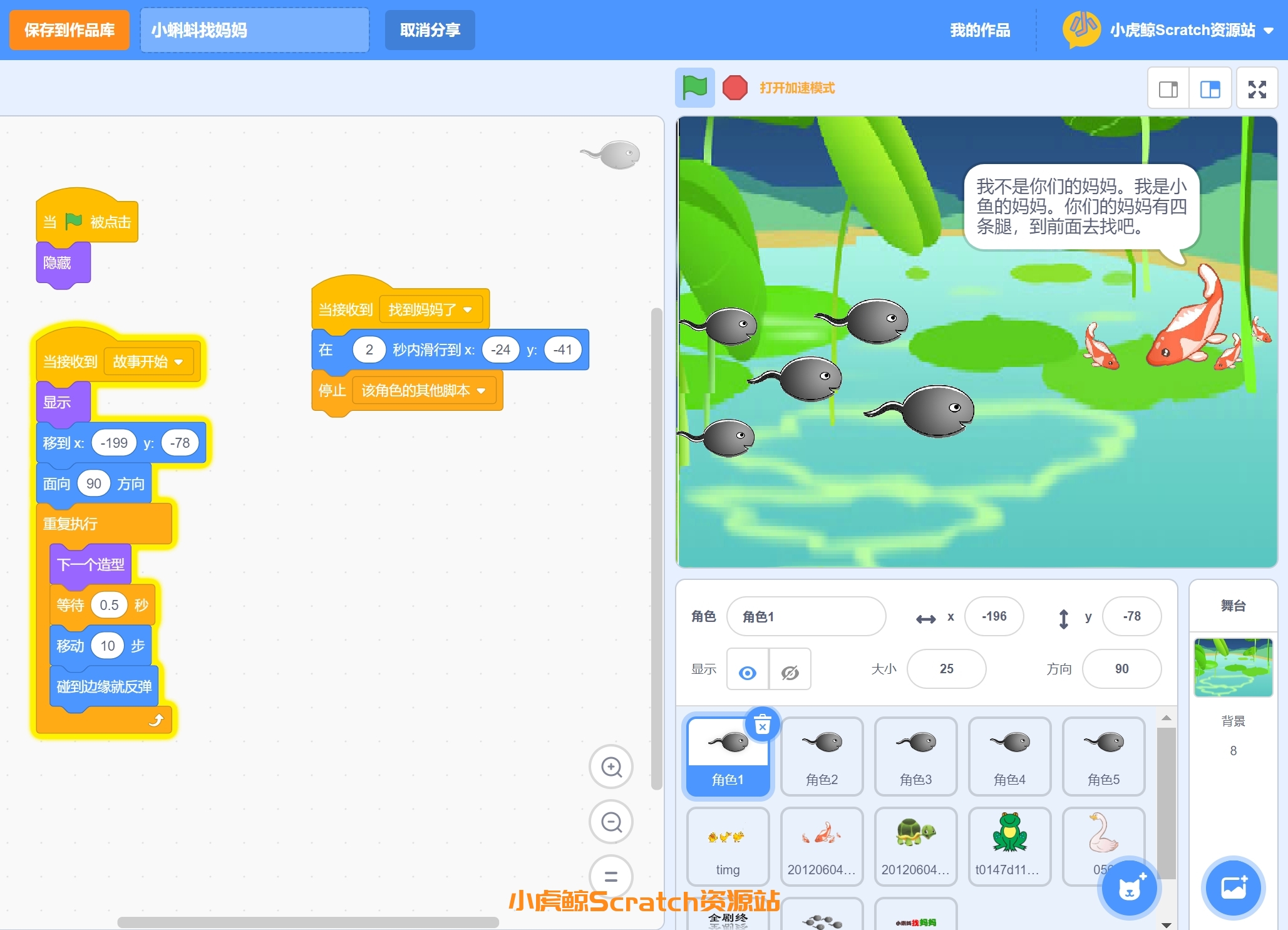 - 角色移动与旋转:为了模拟小蝌蚪在水中的游动效果,小朋友们需要了解如何控制角色的移动和旋转。
