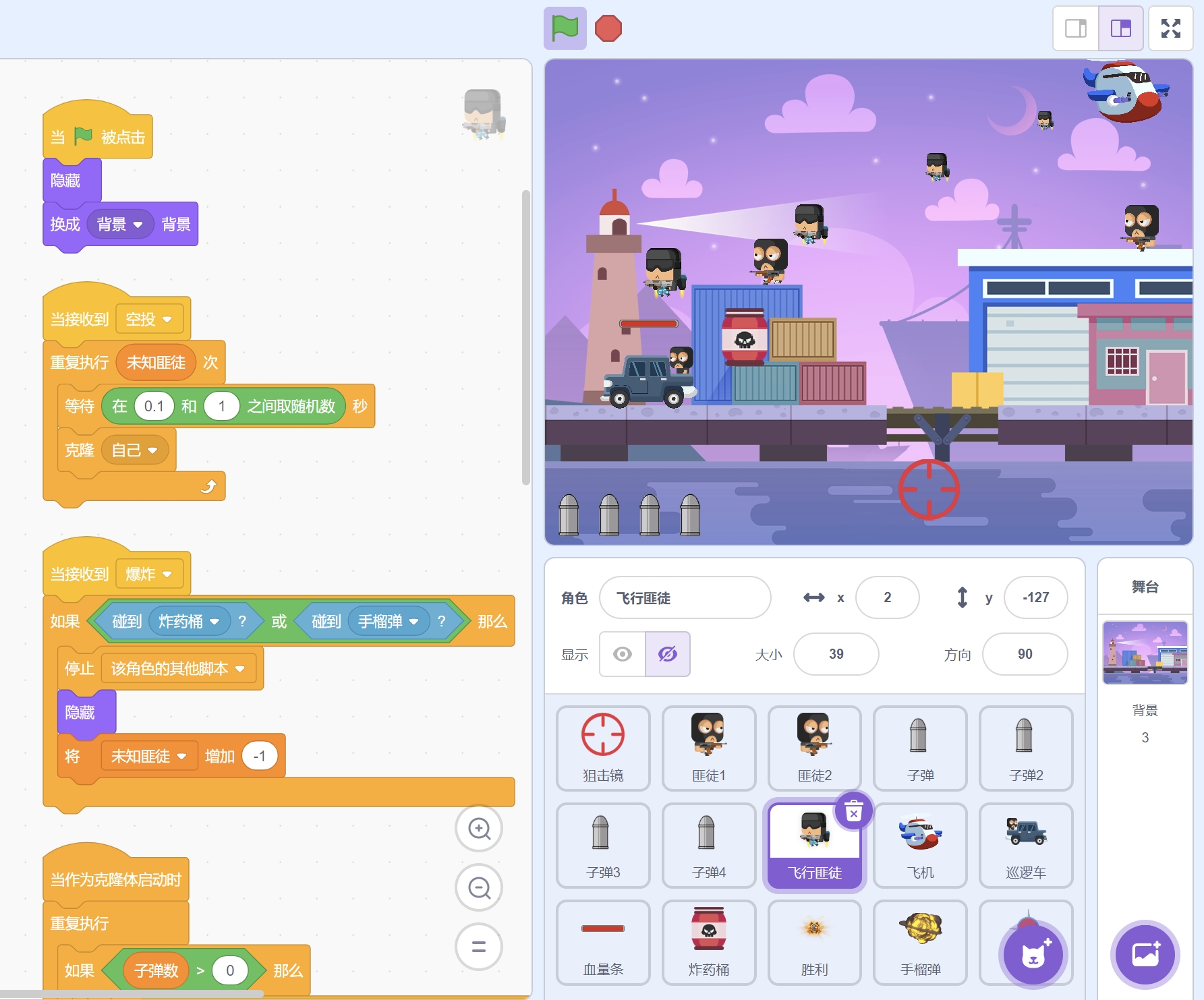 按空格键可以换弹。按v键可以扔手榴弹。然后打到左下角那辆车子后(车有很高的血量),他会发导弹。后拿狙击镜瞄准导弹,导弹可以爆掉。如果你不打导弹,导弹命中你你就死了。还有从天上降下来的飞行匪徒,你要在他们落地之前打死他,否则他们落地了以后枪就瞄准你,你也死了。