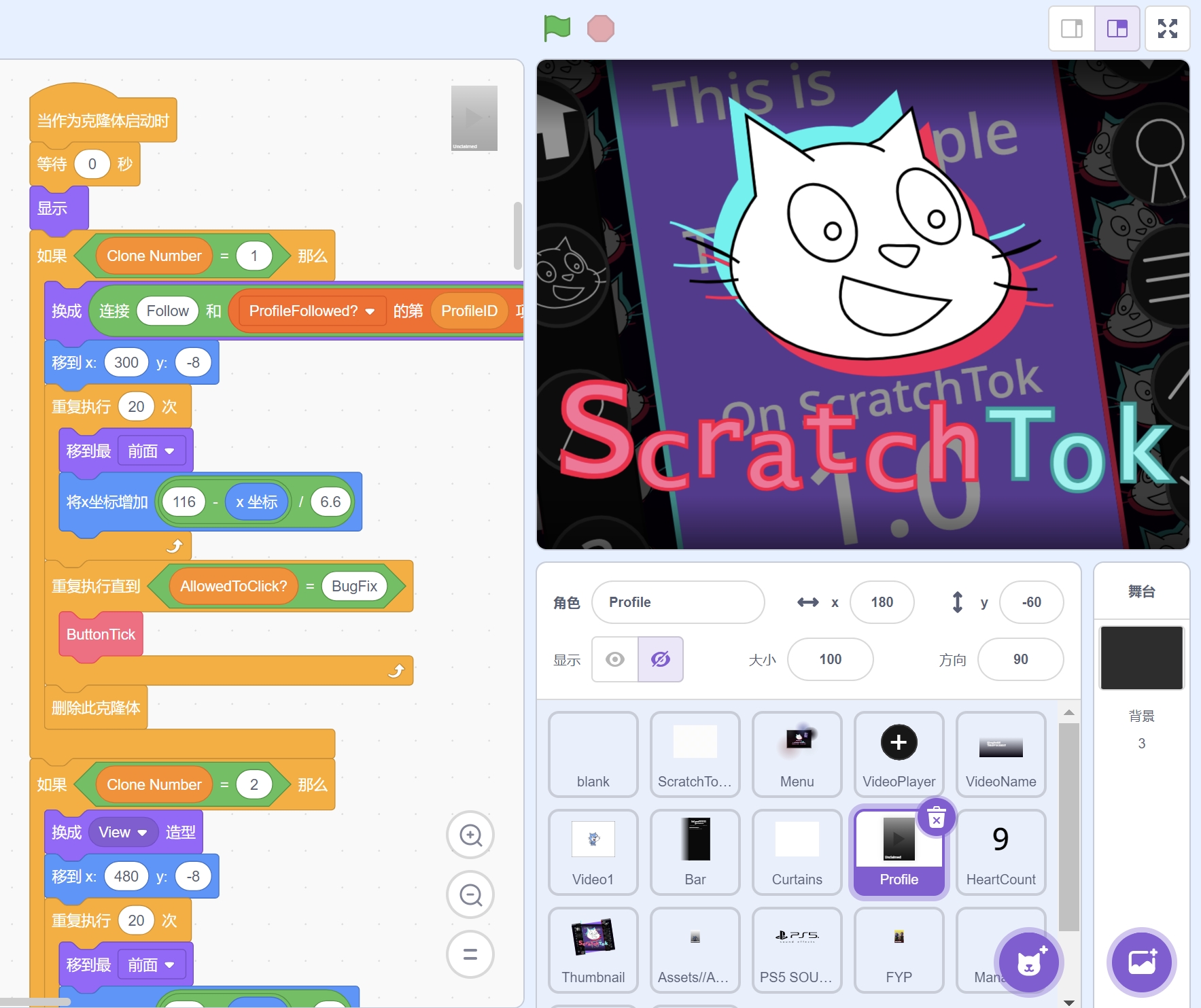 ⭐ScratchTok 是在Scratch上重新创造的Tik-Tok。灵感来自一个叫做 @FANJOUA 的人,他制作了 ScratchTube。ScratchTok 有很多视频供您观看。您可以无限滚动,给视频点赞,关注其他人,甚至创建自己的视频!这个项目花了很长时间(可能因为我经常拖延),所以请通过喜爱和收藏这个项目来支持我们!(我说“我们”是因为这样听起来很酷,其实只是“我”哈哈)感谢您查看 ScratchTok!