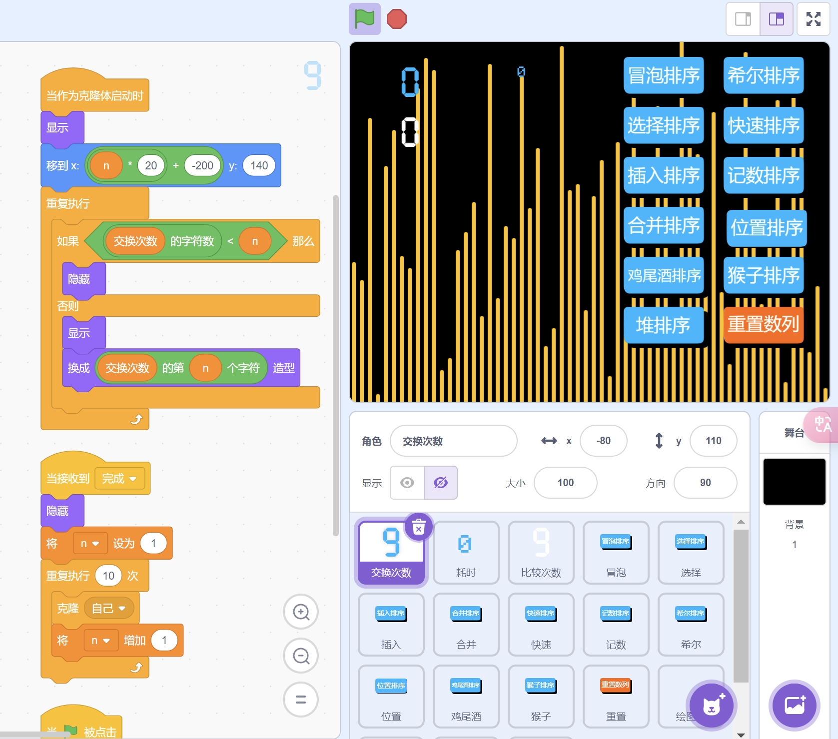 作者Aka STEM 11种排序算法演示 《经典排序算法》是一款专为Scratch编程爱好者设计的教育作品。通过直观的图形界面和互动操作,让你轻松掌握冒泡排序、选择排序等多种经典排序算法的原理与实现。无论是编程初学者还是希望深化算法理解的进阶者,都能在这款作品中找到学习的乐趣与收获。立即下载,开启你的算法探索之旅! 预览 版权说明:资源均源于互联网收集整理,不保证资源的可用及完整性,仅供个人学习研究,请勿商用。喜欢记得支持正版,若侵犯第三方权益,请及时联系站长删除!