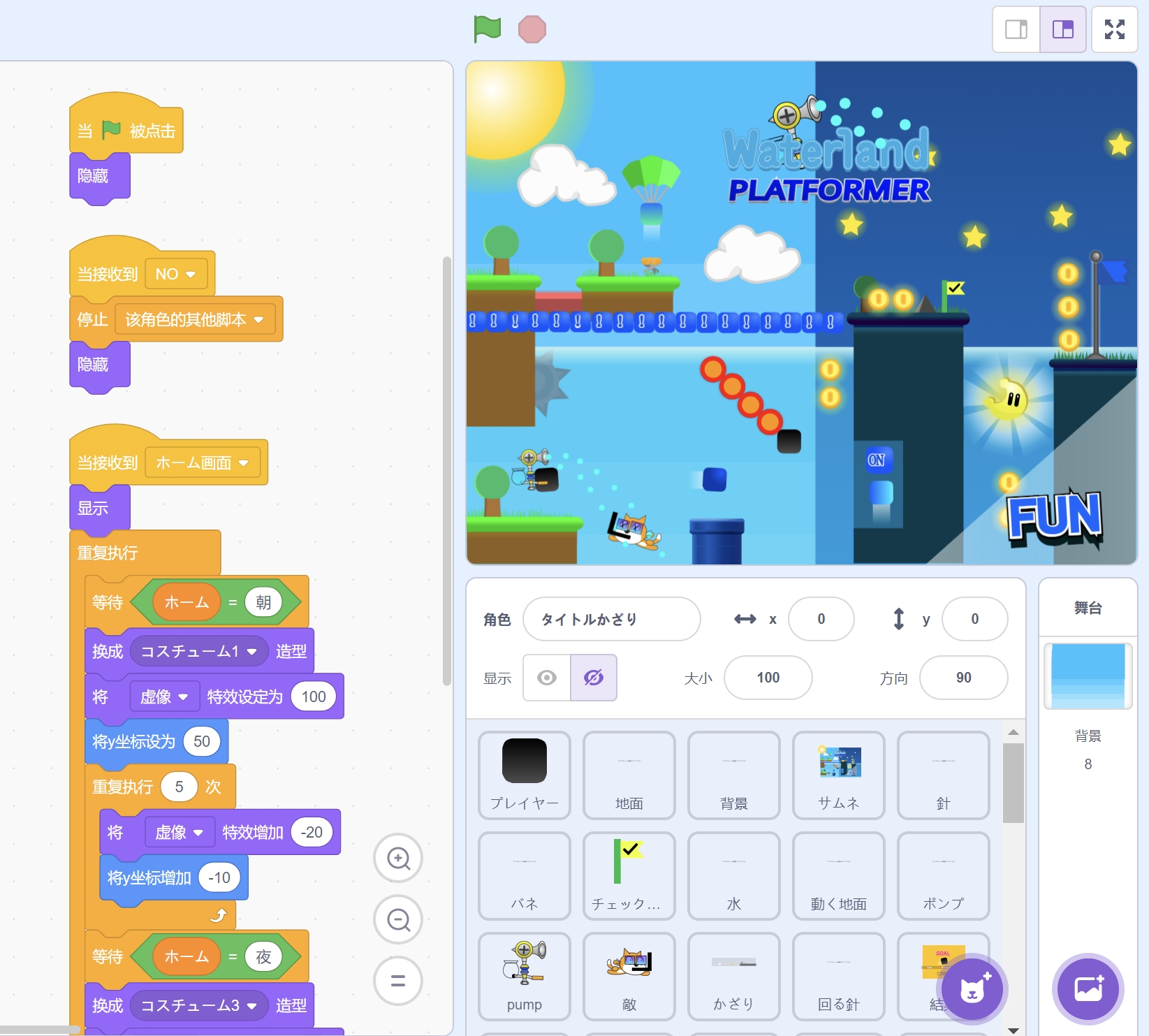 基本操作是使用十字键。关卡中的泵是道具。一旦获得泵,按Z键可以放水。放出的水碰到硬币时会获得硬币,碰到划痕猫时可以击败它。右下角有一个商店,你可以用关卡中收集到的硬币购买物品。如果在商店获得“开关”物品,可以按X键更换角色外观。如果在商店获得“降落伞”物品,可以按空格键在空中停留较长时间。