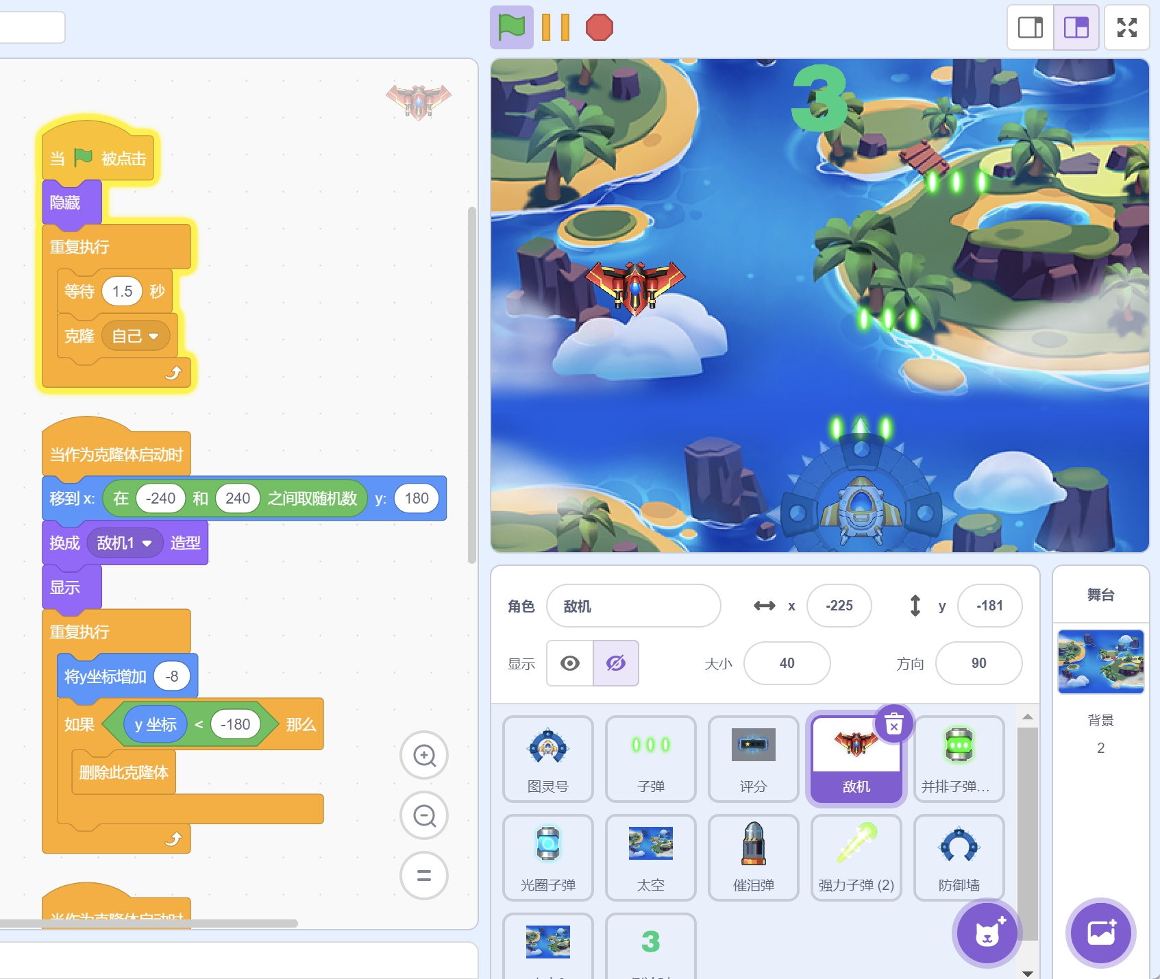 飞机大战的难度中等,用到广播,变量,克隆,重复侦测较多,便于学生综合运用所学习到项目。