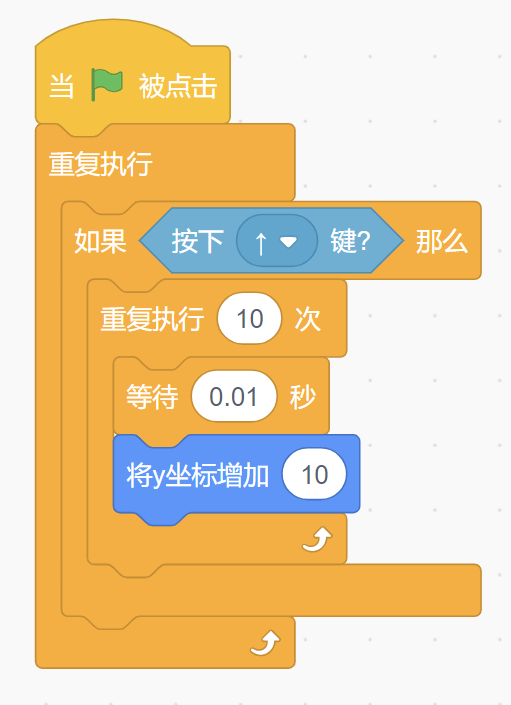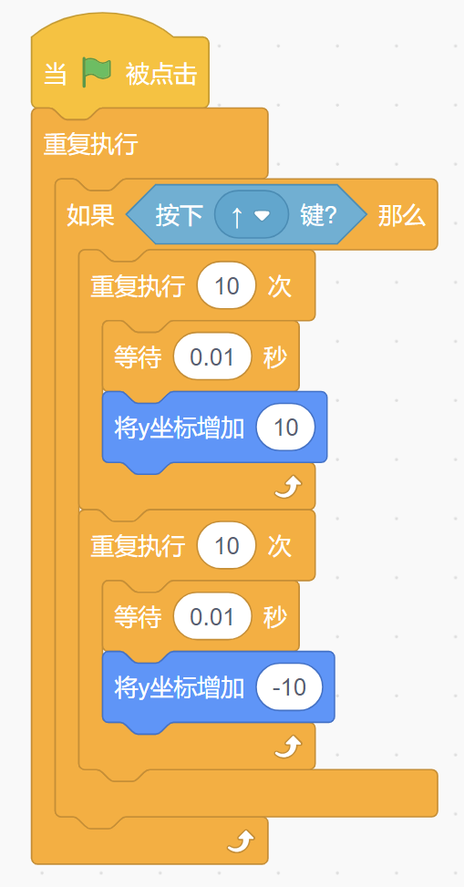 这个代码块会让角色在每次循环时沿 y 轴(垂直方向)上升 10 个单位。改变这个数值可以调整角色跳跃的高度。
