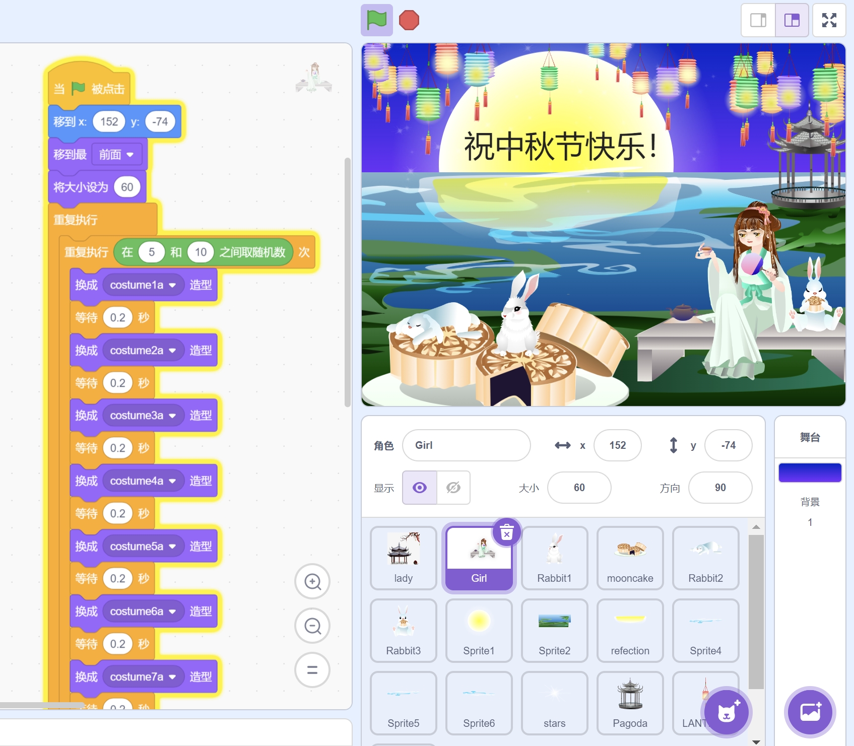 《中秋节动画贺卡》是一款融合传统与现代创意的Scratch节日作品。它以中秋节为背景,通过细腻的动画设计和温馨的故事情节,生动展现了中秋团圆的美好寓意。贺卡中的每一个细节都充满了节日的喜庆与温馨,让人仿佛置身于那轮明月之下,与家人共度佳节。这款作品不仅适合作为中秋节的祝福礼物,更是Scratch爱好者们展示自己创意与才华的佳作。