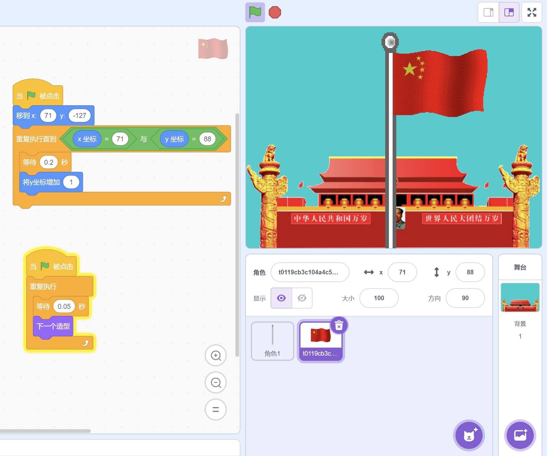 《国庆节升旗仪式》是一款精心设计的Scratch节日教育作品,旨在通过编程的方式让孩子们深入了解国庆节的庄重与意义。作品中,孩子们将亲手模拟升旗仪式的全过程,从国旗缓缓升起的那一刻起,感受身为中国人的自豪与荣耀。同时,这款作品也是一次编程技能的实践,让孩子们在趣味横生的互动中,学习Scratch编程知识,培养逻辑思维和创造力。无论是作为节日庆祝还是编程学习,都是不可多得的好选择。