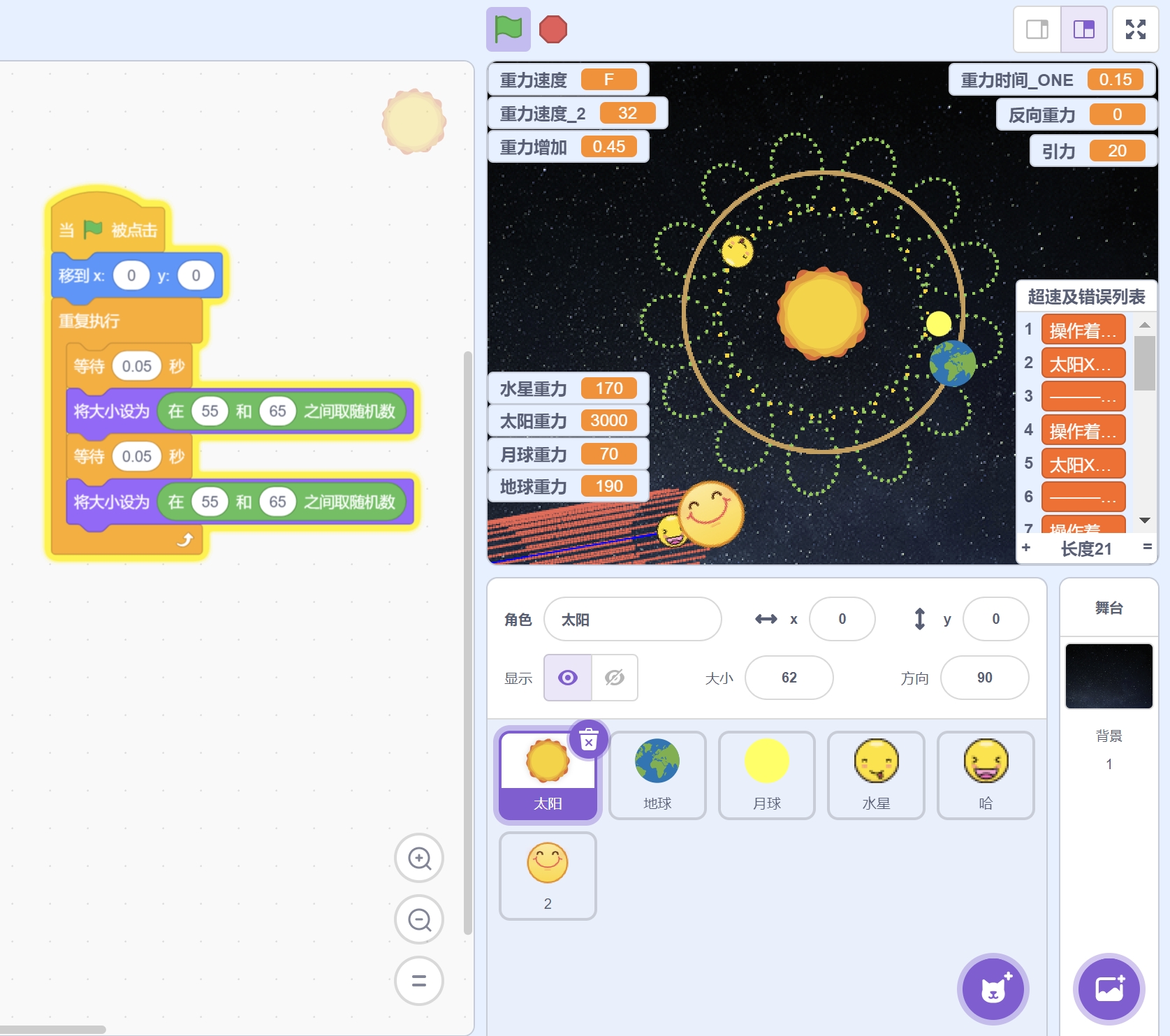 《星球轨道模拟》是一款寓教于乐的Scratch编程教学作品,专为对宇宙充满好奇的少年儿童设计。通过这款作品,孩子们不仅能学习到Scratch编程的基础技能,还能在模拟星球轨道运行的过程中,深入了解天体物理学的奥秘。作品设计巧妙,互动性强,让孩子们在动手实践中提升逻辑思维能力,激发对科学探索的兴趣和热情。适合作为课外学习或科学兴趣小组的活动项目,让学习变得更加生动有趣。