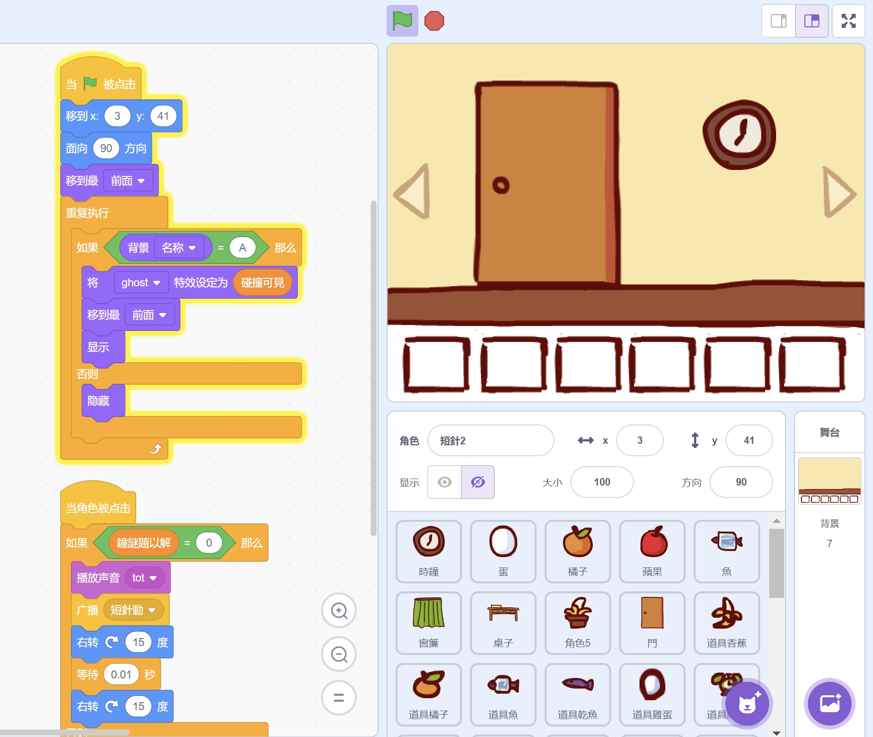 在游戏中,你需要找到三样道具:橘子、苹果和鸡蛋,并将它们放入桌上的黄色盒子内,按照颜色对应的凹槽顺序,成功打开门即可过关。