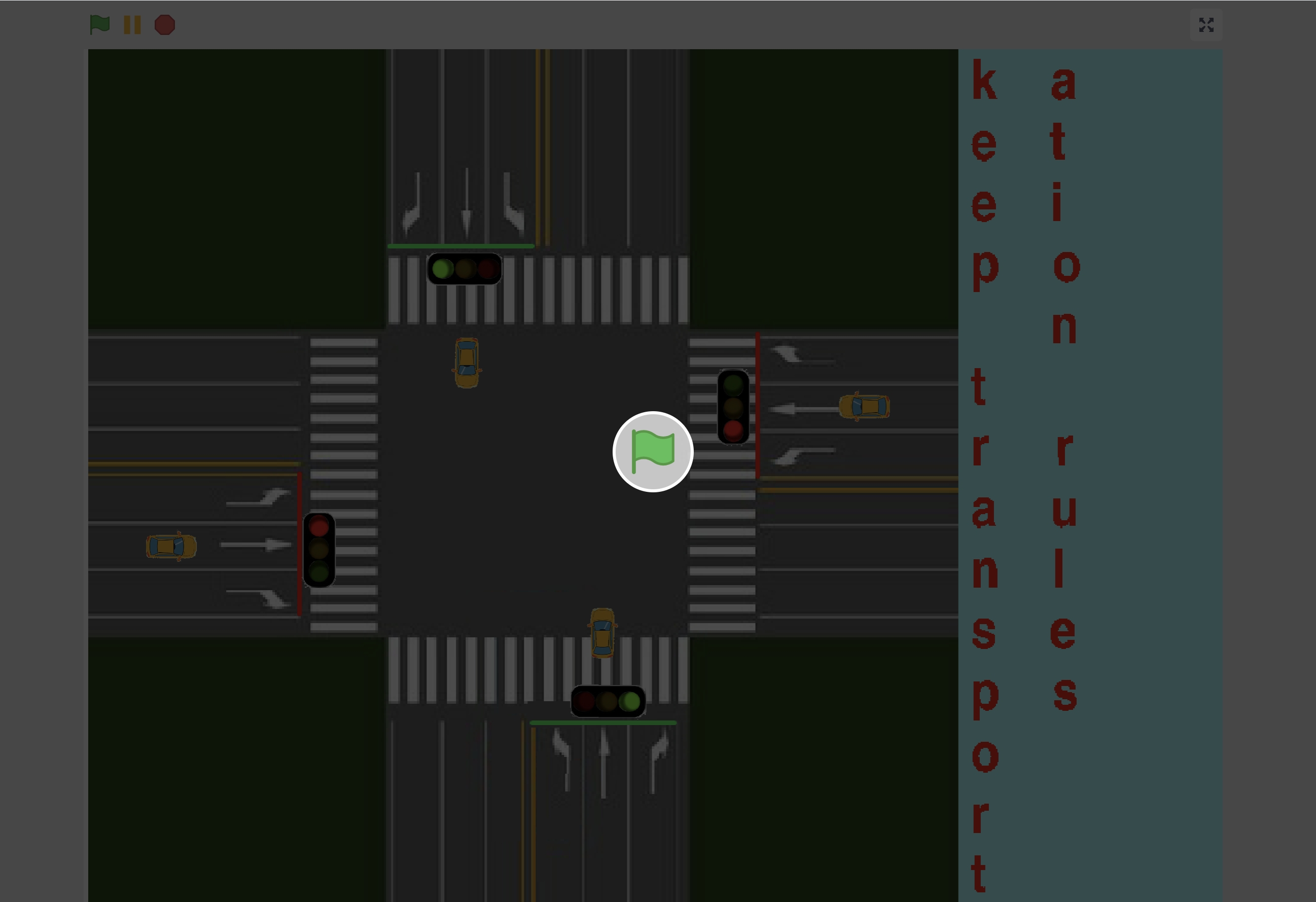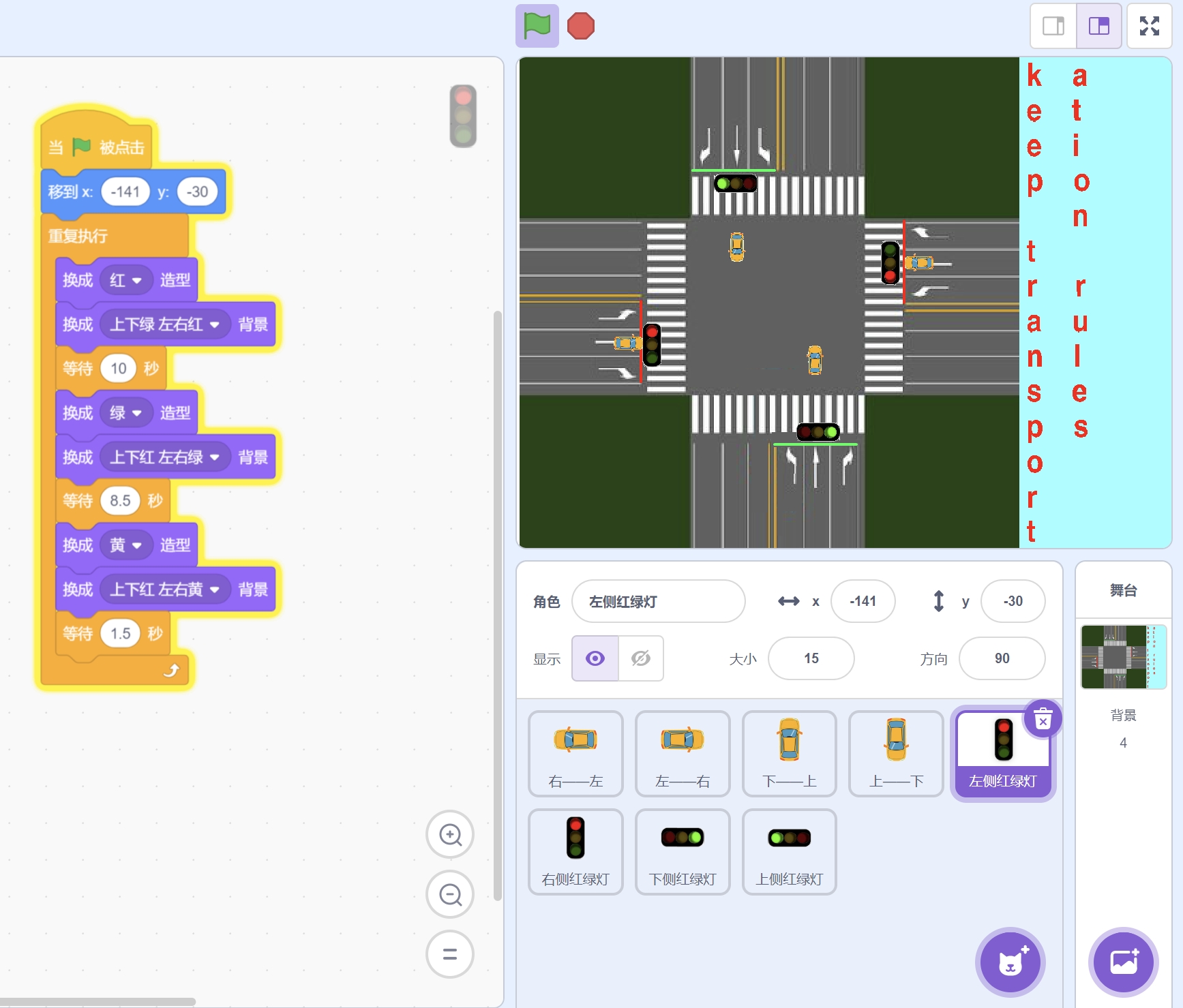 《十字路口自动红绿灯》是一款模拟十字路口交通情况的作品。点击绿旗后,程序会自动运行,展示交通信号灯如何管理十字路口的交通流量。通过这个模拟,你可以观察到红绿灯的切换过程,了解信号灯如何确保车辆和行人的安全通行。