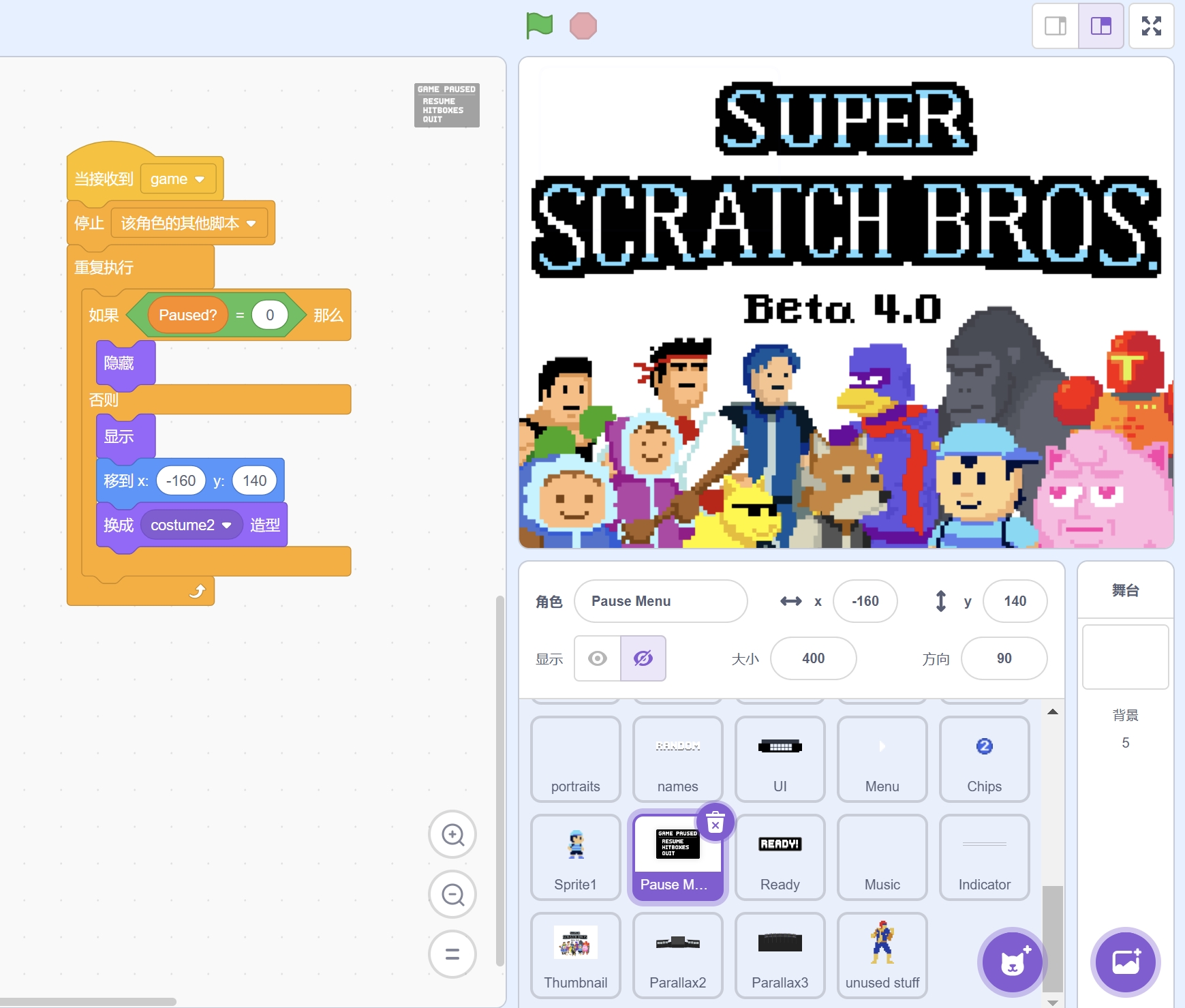 《超级Scratch兄弟测试版4.0》是一款多角色对战游戏,灵感来源于经典的格斗游戏。玩家可以选择不同角色,施展各种攻击招式,在多种独特的舞台中进行激烈的战斗。游戏新增了角色、舞台、规则菜单和背景音乐,进一步丰富了游戏体验。通过攻击、防御、特殊招式等操作,你可以体验到充满策略性和乐趣的战斗!