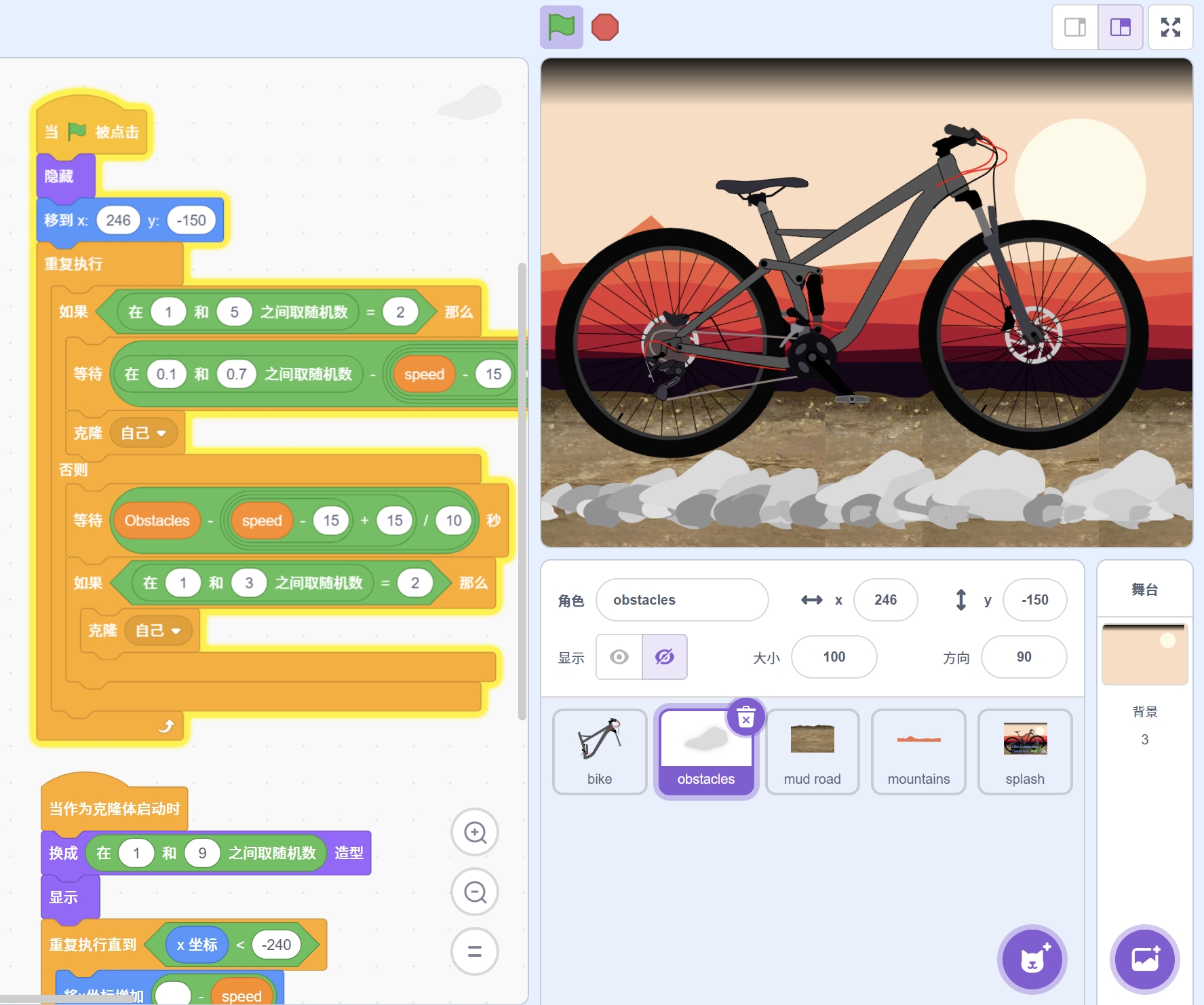 - 调整速度:通过调节变量来控制自行车移动速度。