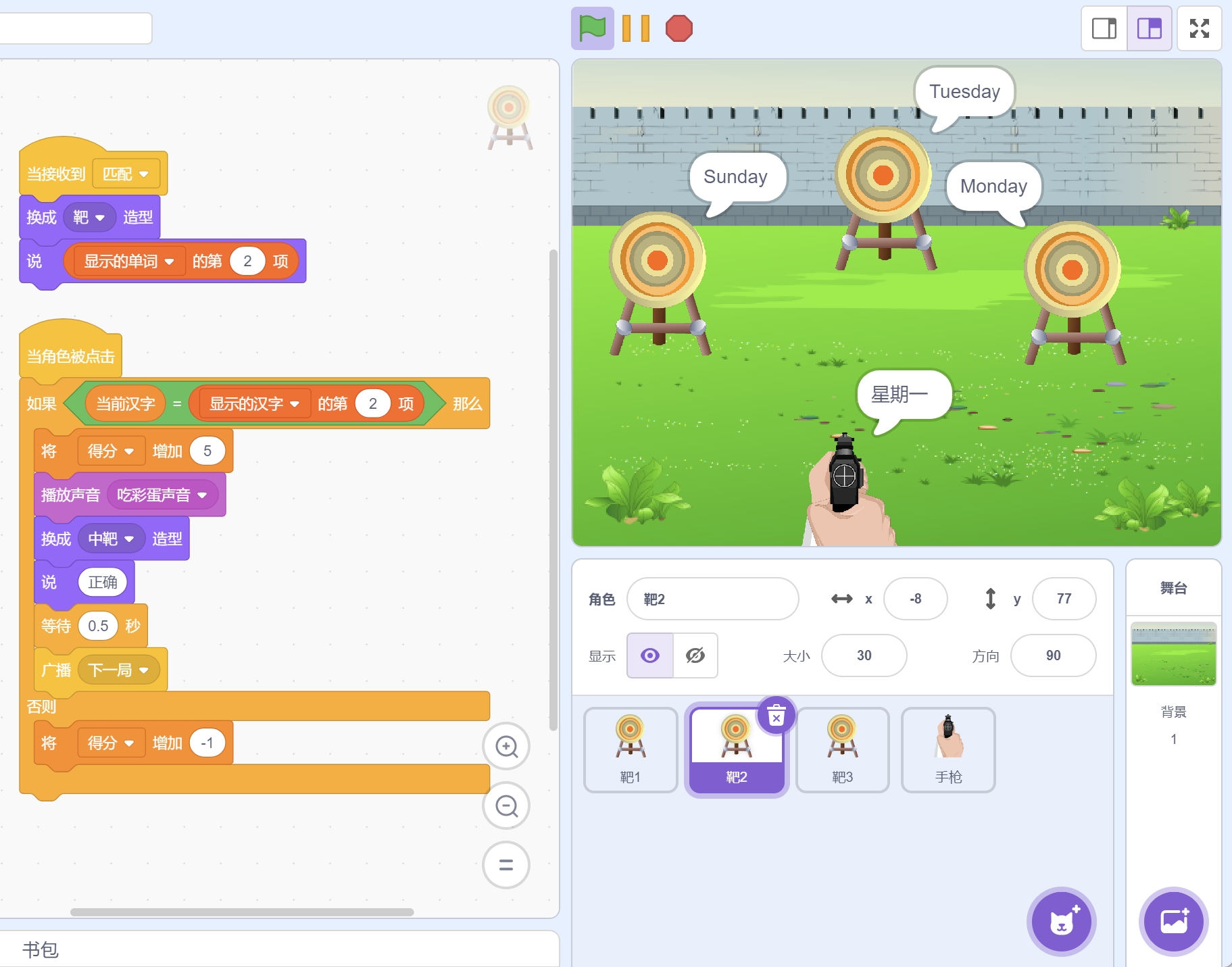 这是一款趣味十足的Scratch教学作品,通过射击练习帮助你学习并记住中文和英文星期的对应关系!🔤🗓️