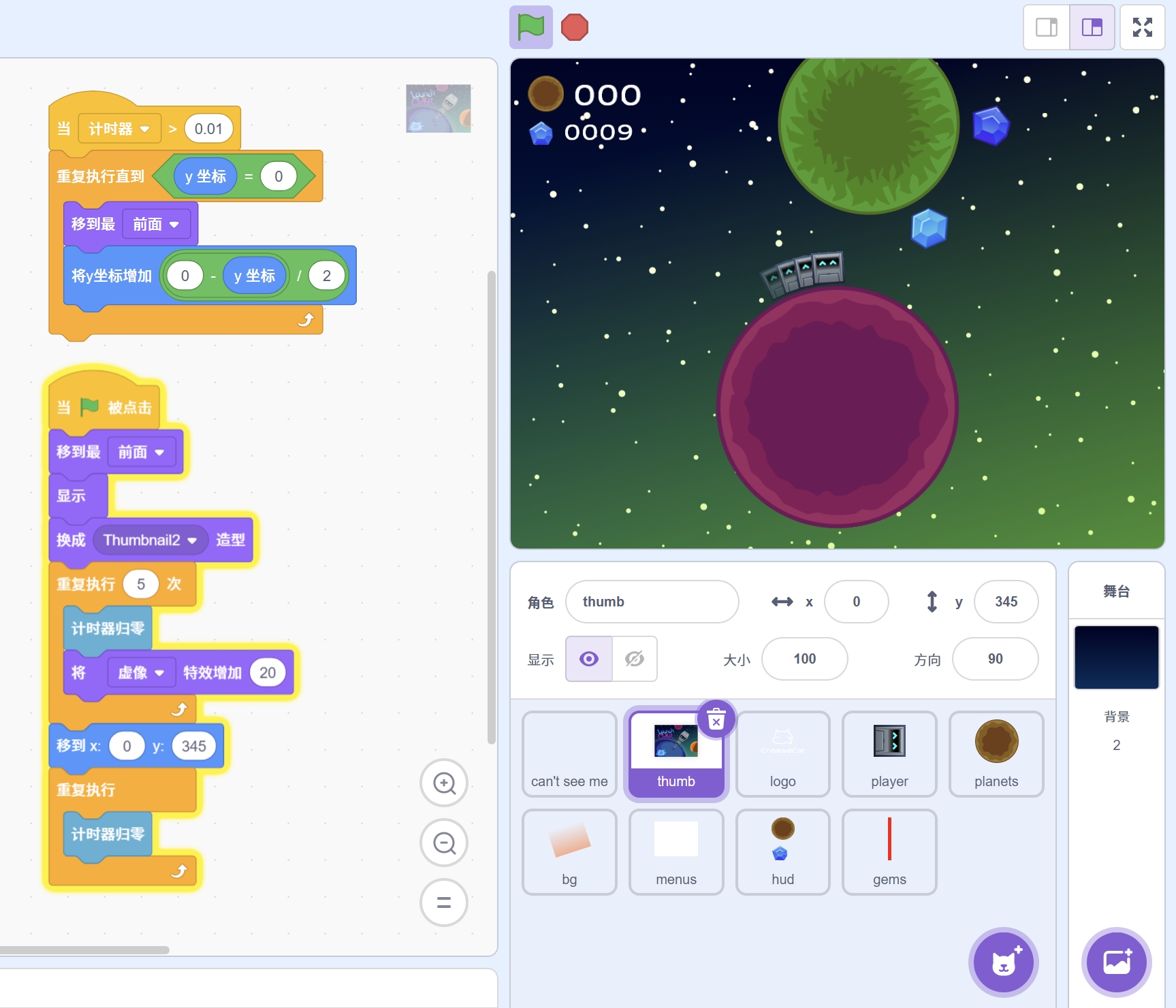 - 按 空格键 启动发射,选择正确的发射角度来跳跃到下一个星球。