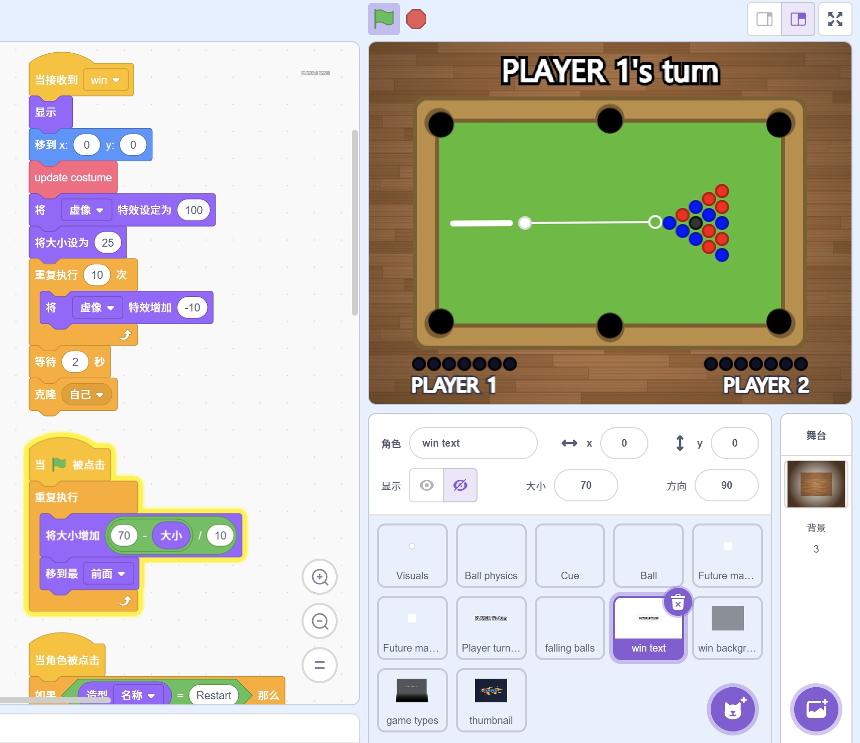 在游戏开始时,击打第一颗球会决定你的球的颜色。比如,如果你(玩家1)先击中蓝色球,那么玩家1将在接下来的比赛中需要击打蓝色的球,直到击打8号球为止。 - 胜利条件: