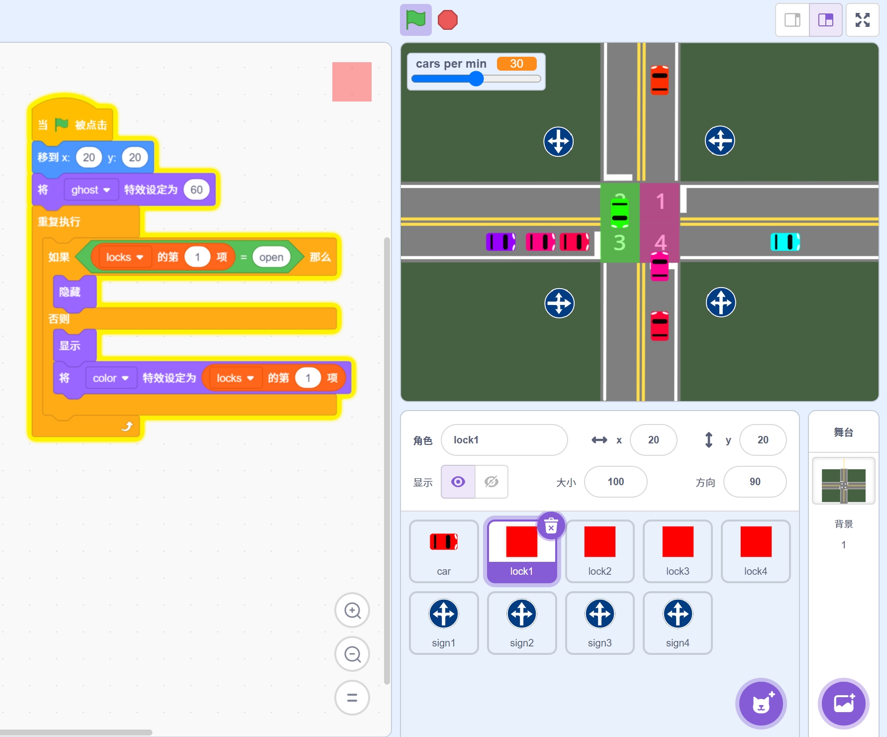 在《交通规划》这款Scratch作品中,你将扮演一位交通指挥官,合理规划交通流动,确保汽车安全顺利通过四路交叉口。通过“占领”交叉口的四个区域来确保车辆通行。利用闪烁的指示灯和交通标志来控制车辆的行驶方向,避免交通堵塞和事故发生!🔧🚦