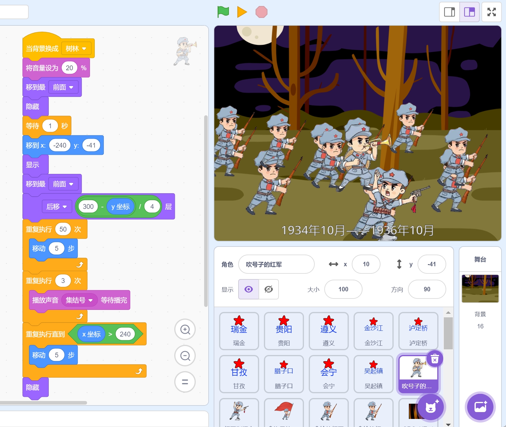 这是一款由 Scratch 制作的动画作品,通过生动的画面与解说,带领你了解长征的历史背景、关键事件与英雄故事,感受红军不屈不挠的精神!