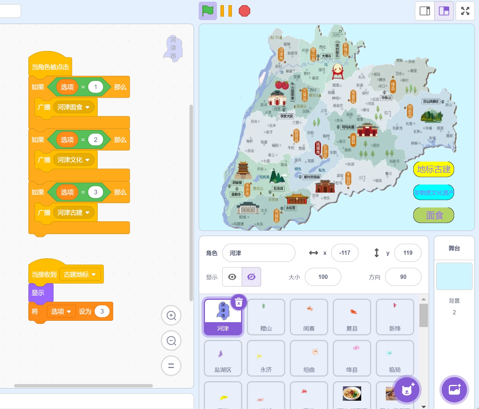 ✨ 《大美河东》 是一款以 Scratch 制作的互动式文化科普作品,通过有趣的方式展现河东地区十三个县市的独特魅力!让我们一起了解这片土地的风土人情、非遗文化与历史遗迹吧!