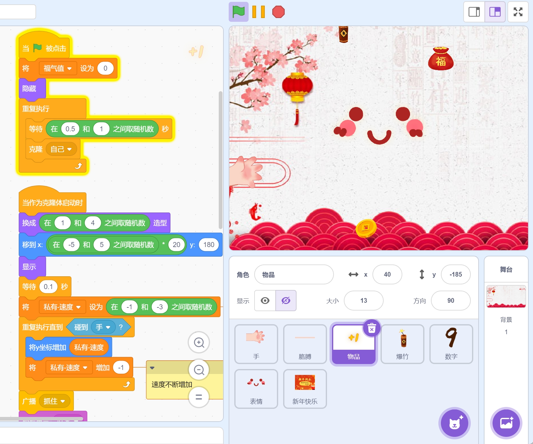 - 屏幕上方会掉下 福袋、金币 和 爆竹。