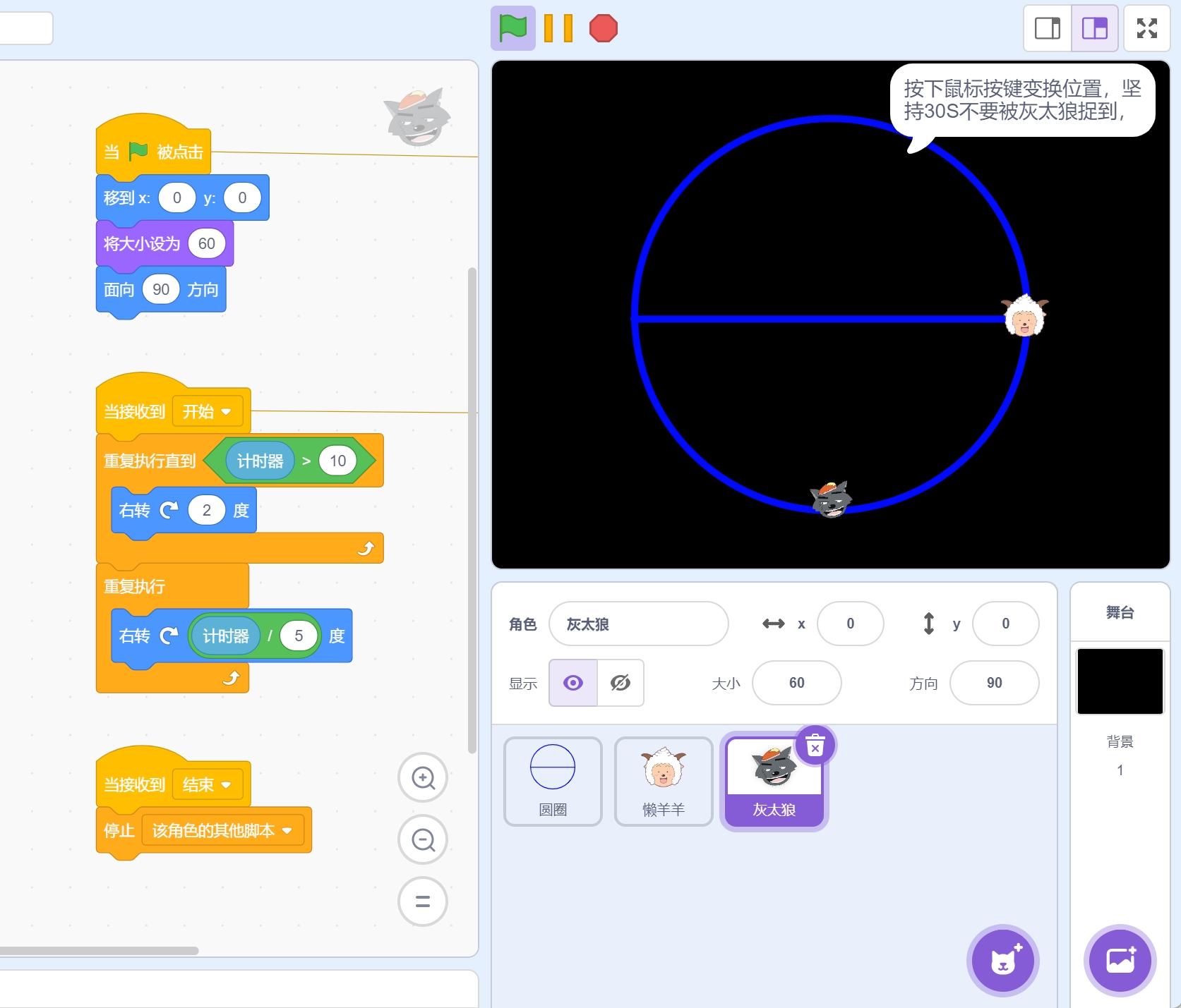 - 目标:成功躲避灰太狼的追击,坚持 30秒 获得胜利!