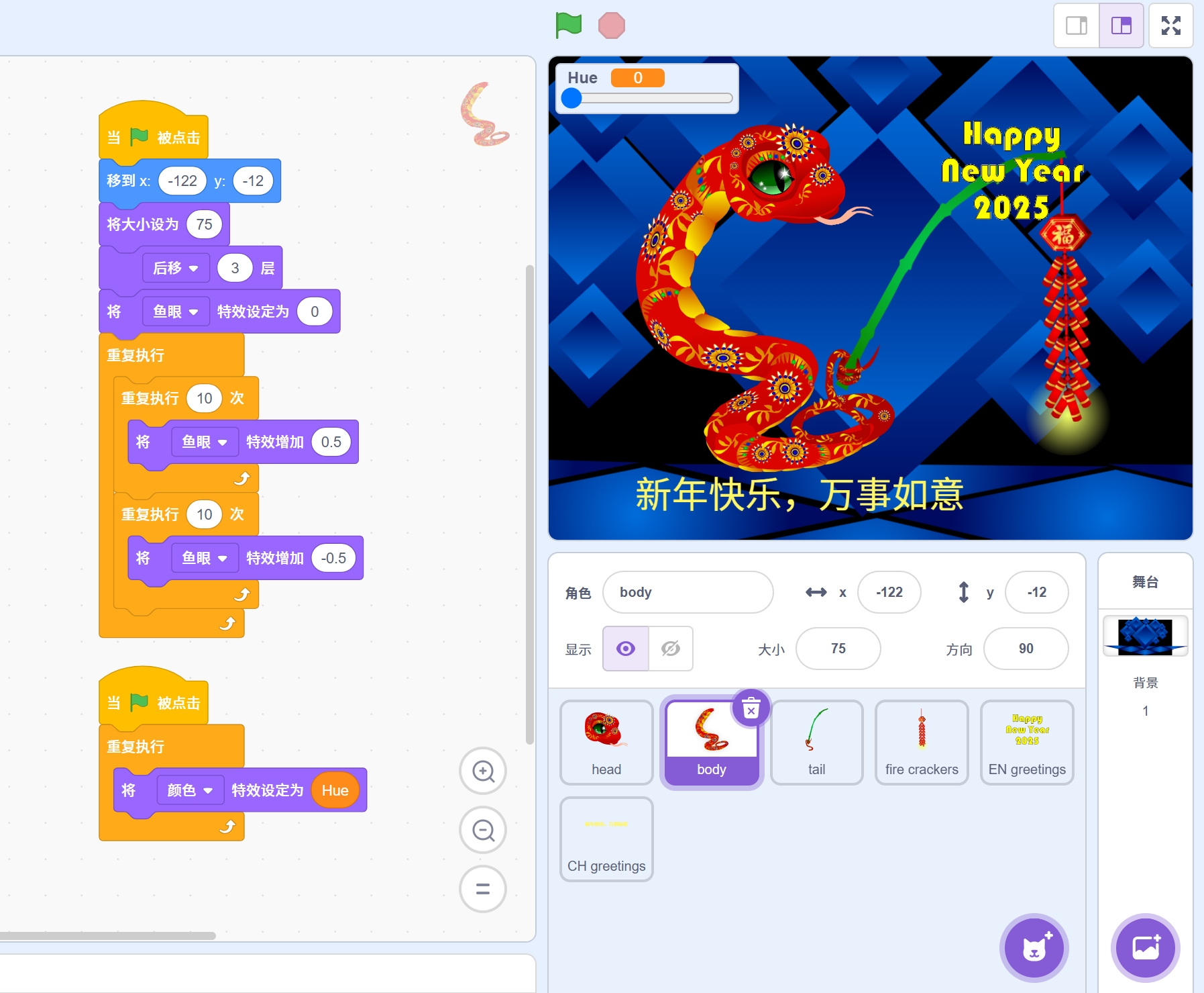 - 传统与现代结合:画面采用Scratch矢量编辑器手绘,背景音乐则由经典的2025年贺岁MV伴奏,完美融合传统春节与现代创意。