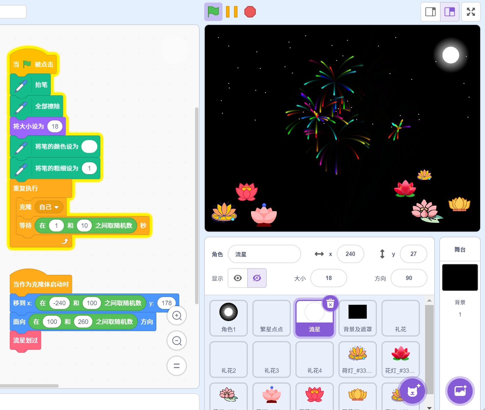 用四键操控打造你的专属烟花盛宴!这款Scratch作品通过A/S/D/W独立触发不同烟花轨迹,结合节日花灯与流星特效,带你沉浸式体验元宵夜空的绚丽光影!