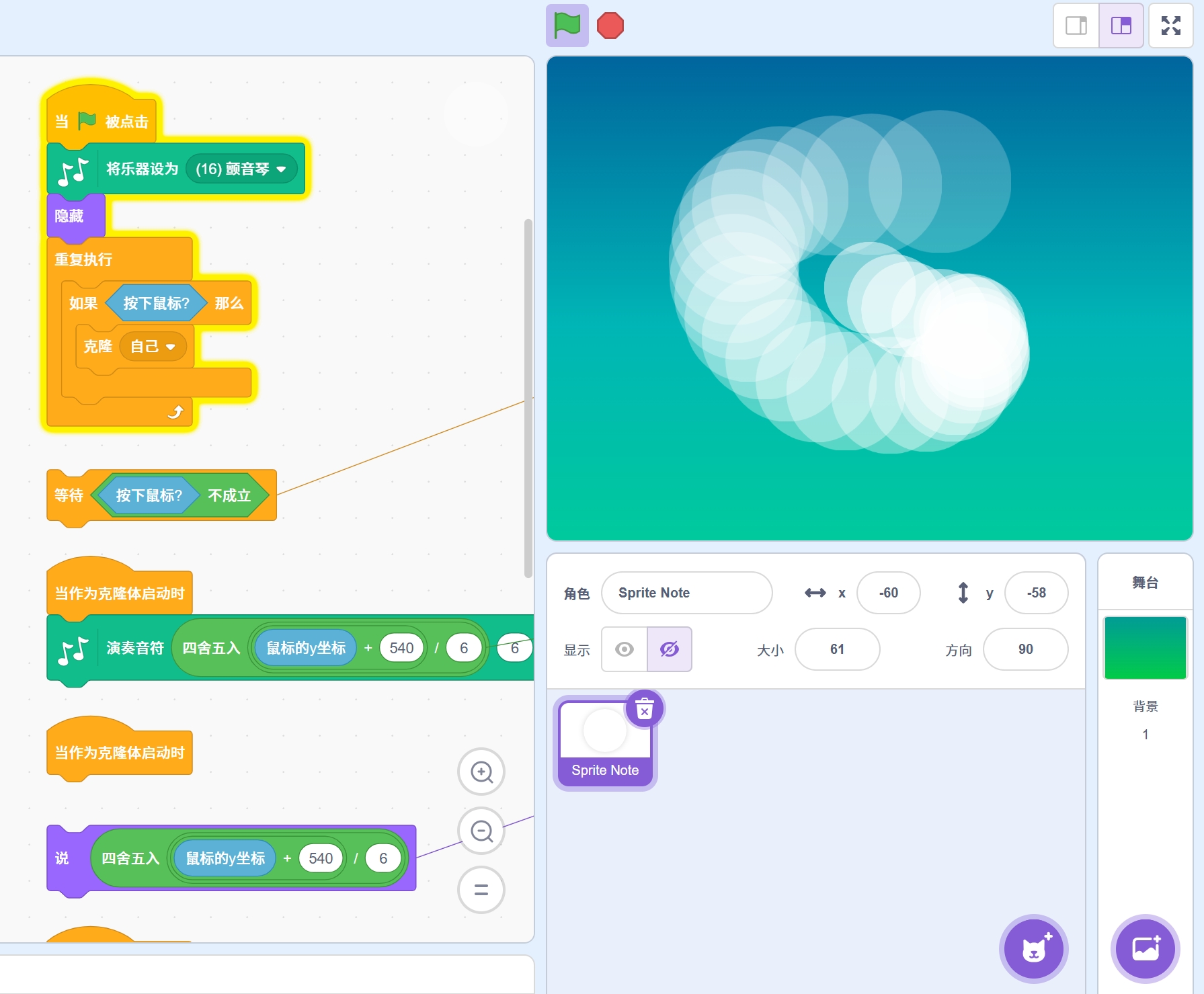 《音律雨滴》是一款Scratch音画互动程序,通过点击或拖拽鼠标在舞台上创造独特的音乐与视觉效果。每一滴雨滴都是一个音符,每一次点击都是一次创作,快来打造属于你的视听盛宴!
