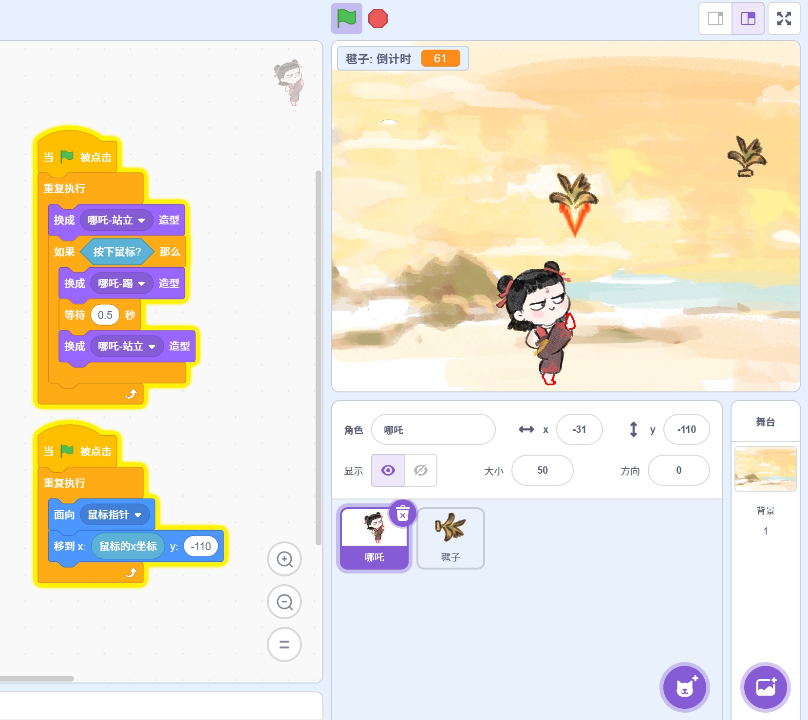 《哪吒踢毽》是一款简单而有趣的Scratch教学作品案例,玩家将控制哪吒踢毽子。游戏通过鼠标操作,玩家需要确保毽子不掉落并尽可能长时间地维持它在空中。游戏考验玩家的反应速度和精准度,适合放松和娱乐。