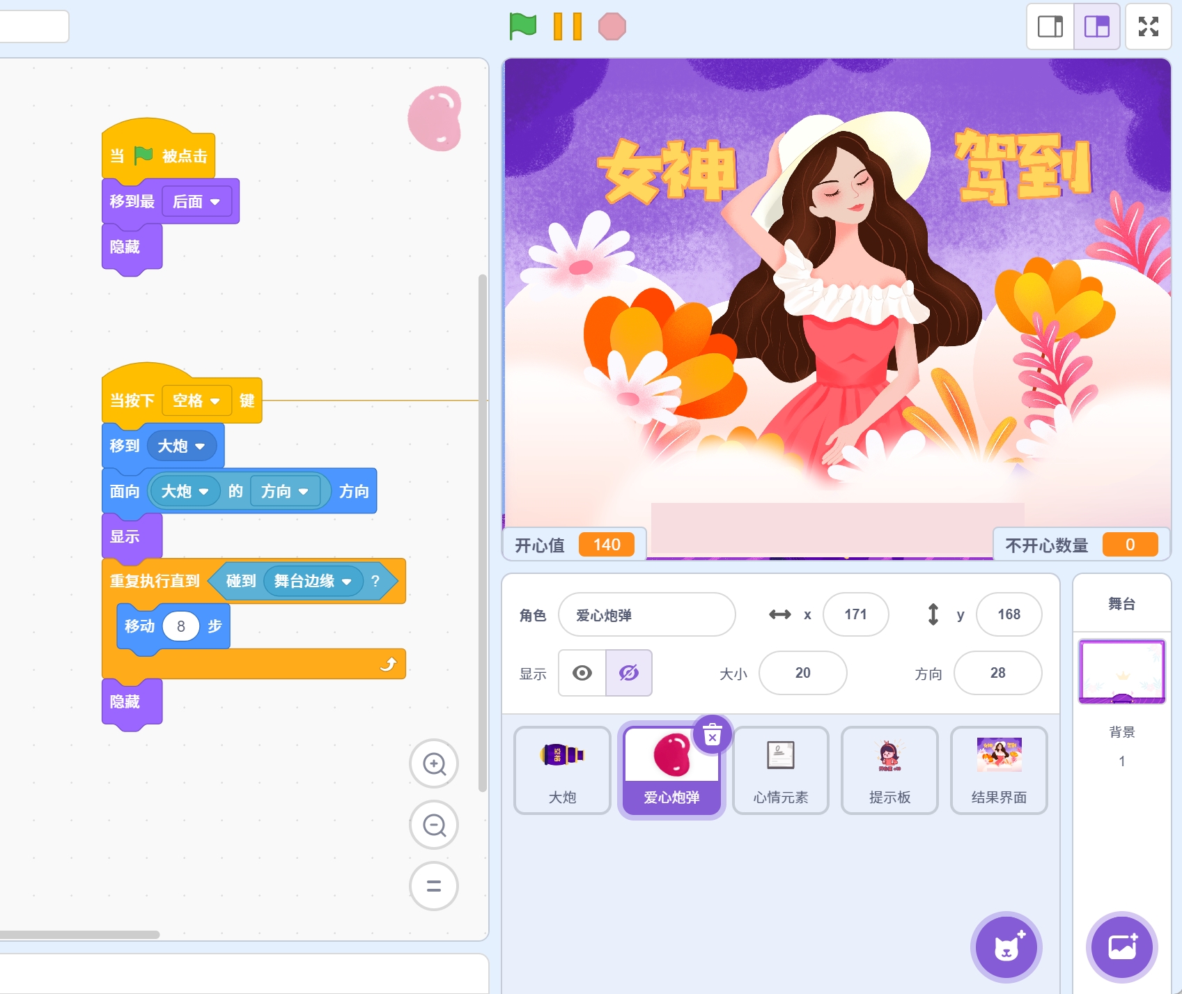 《女神驾到》是一款趣味十足的Scratch互动游戏,玩家需要通过发射爱心炮弹来消除不开心的事件,让世界充满欢乐!🎯💖 但要小心,如果误击了开心事件,开心值会降低,当开心值低于0,游戏就会失败。快来挑战吧,看看你能否成功清除所有的不开心事件,迎接快乐的到来!✨