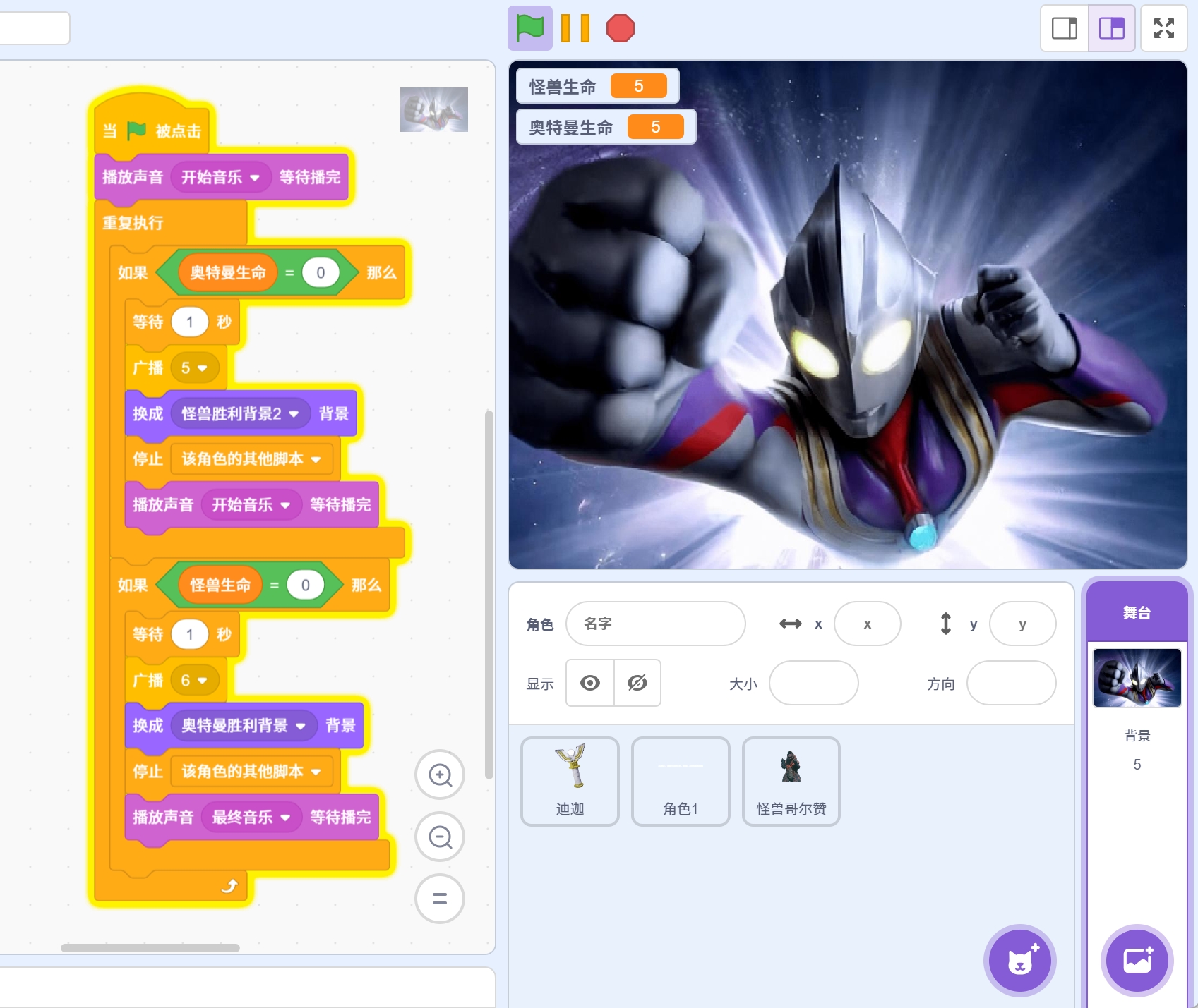 《简单方程求解》是一款Scratch教学作品,结合迪迦奥特曼的主题,让数学学习变得更具趣味性和互动性!🦸♂️✨ 玩家将通过解答方程来控制奥特曼战斗,正确回答时,奥特曼会发起攻击,而错误回答则会被怪兽反击。快来挑战你的数学计算能力,帮助奥特曼战胜怪兽吧!💥👾