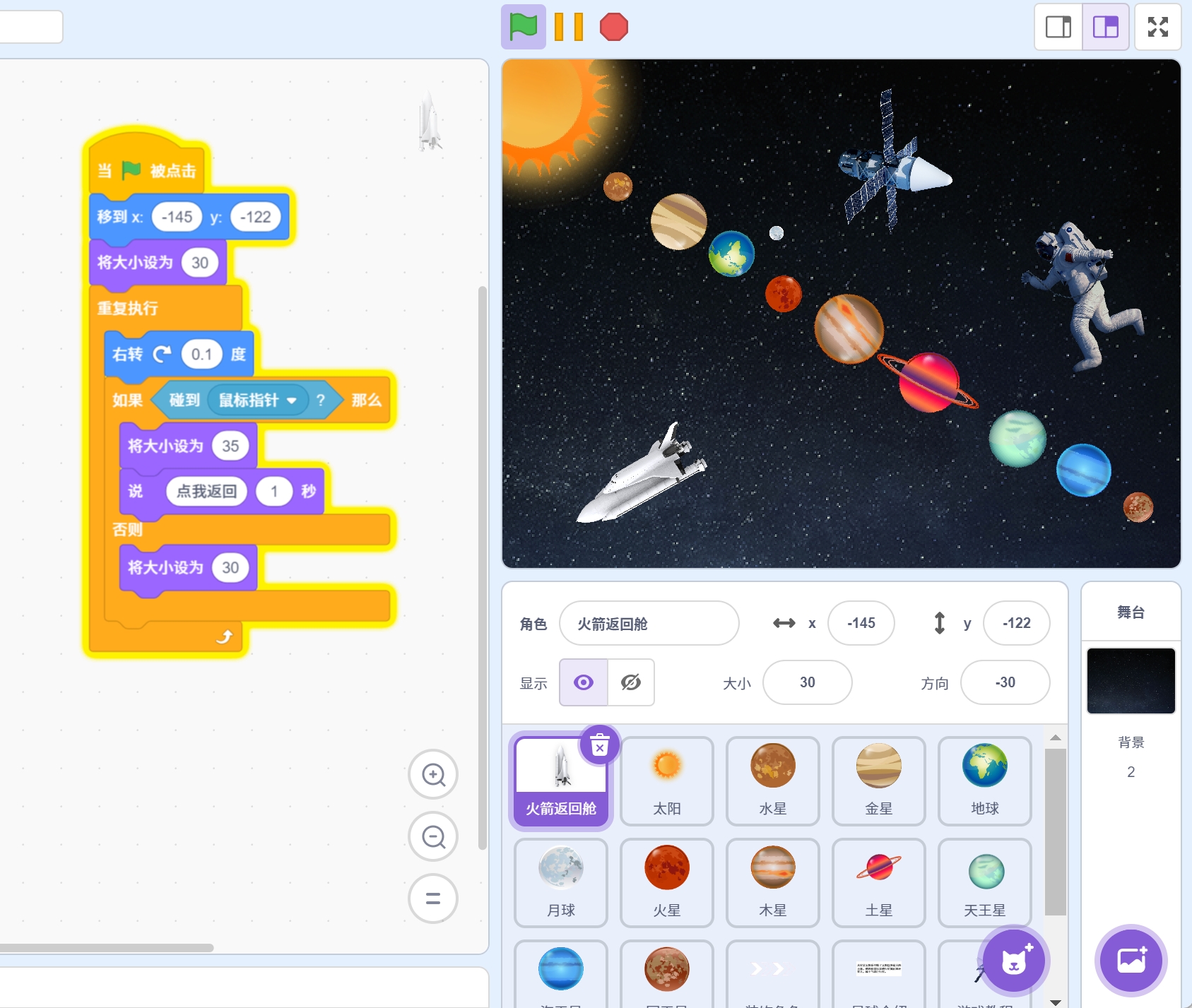 🌌 《宇宙小百科》是一款基于Scratch的科普互动作品,让孩子们在探索太阳系的过程中轻松学习天文知识!🔭✨ 作品涵盖太阳系中的11个天体,玩家可以点击和互动,了解它们的特性和有趣知识!🚀