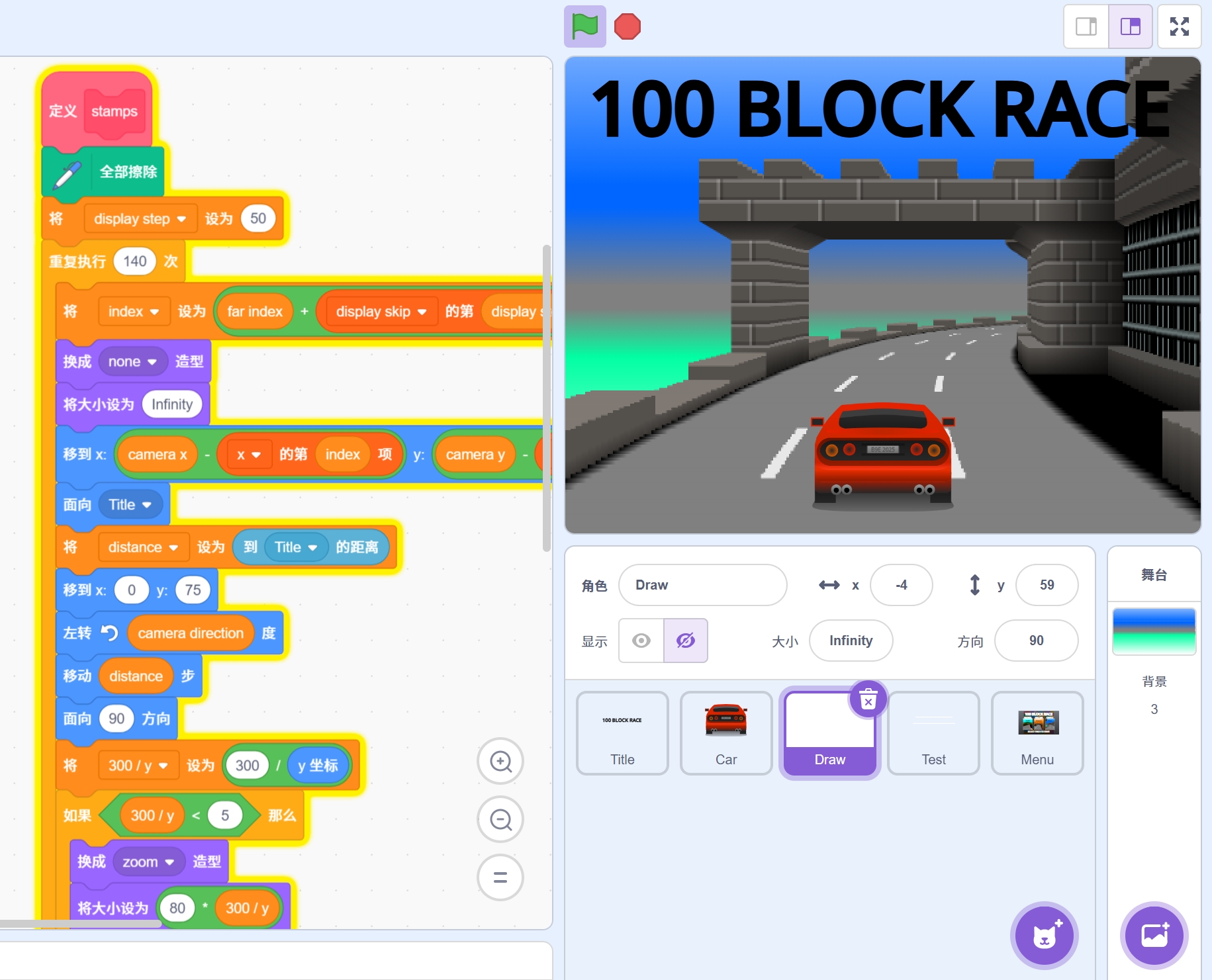 《100方块极速赛道3D》 是一款基于Scratch的极限赛车游戏, 你需要驾驶赛车在不同赛道上极速前进,躲避障碍,顺利冲向终点!🏆 但要注意——没有刹车,速度会越来越快! 🚗💨