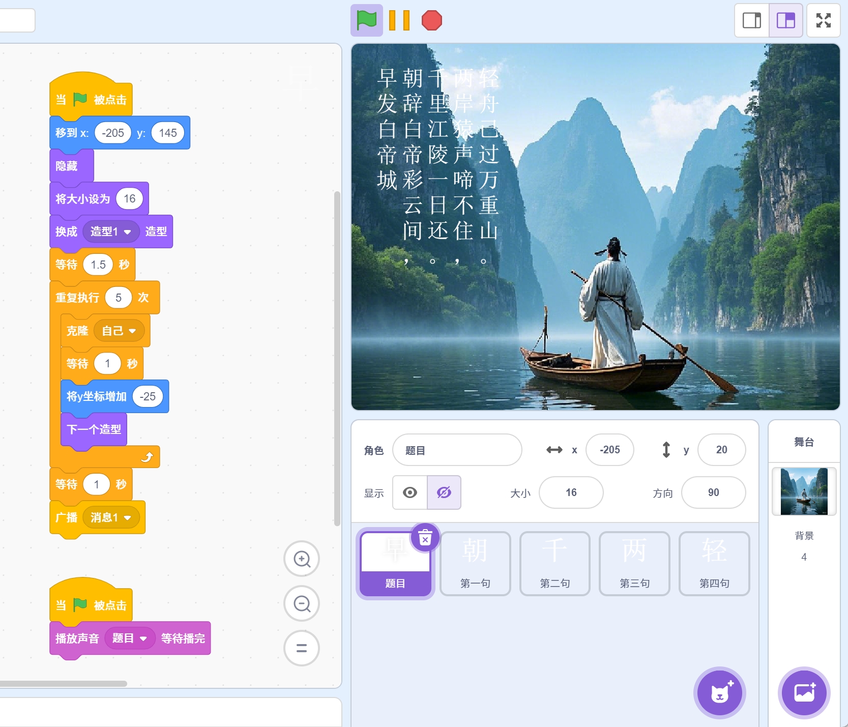 《早发白帝城》是一款Scratch古诗朗诵动画作品,通过生动的动画与朗诵相结合,让诗词更加生动形象,帮助孩子理解和欣赏这首千古名篇。🌿📖