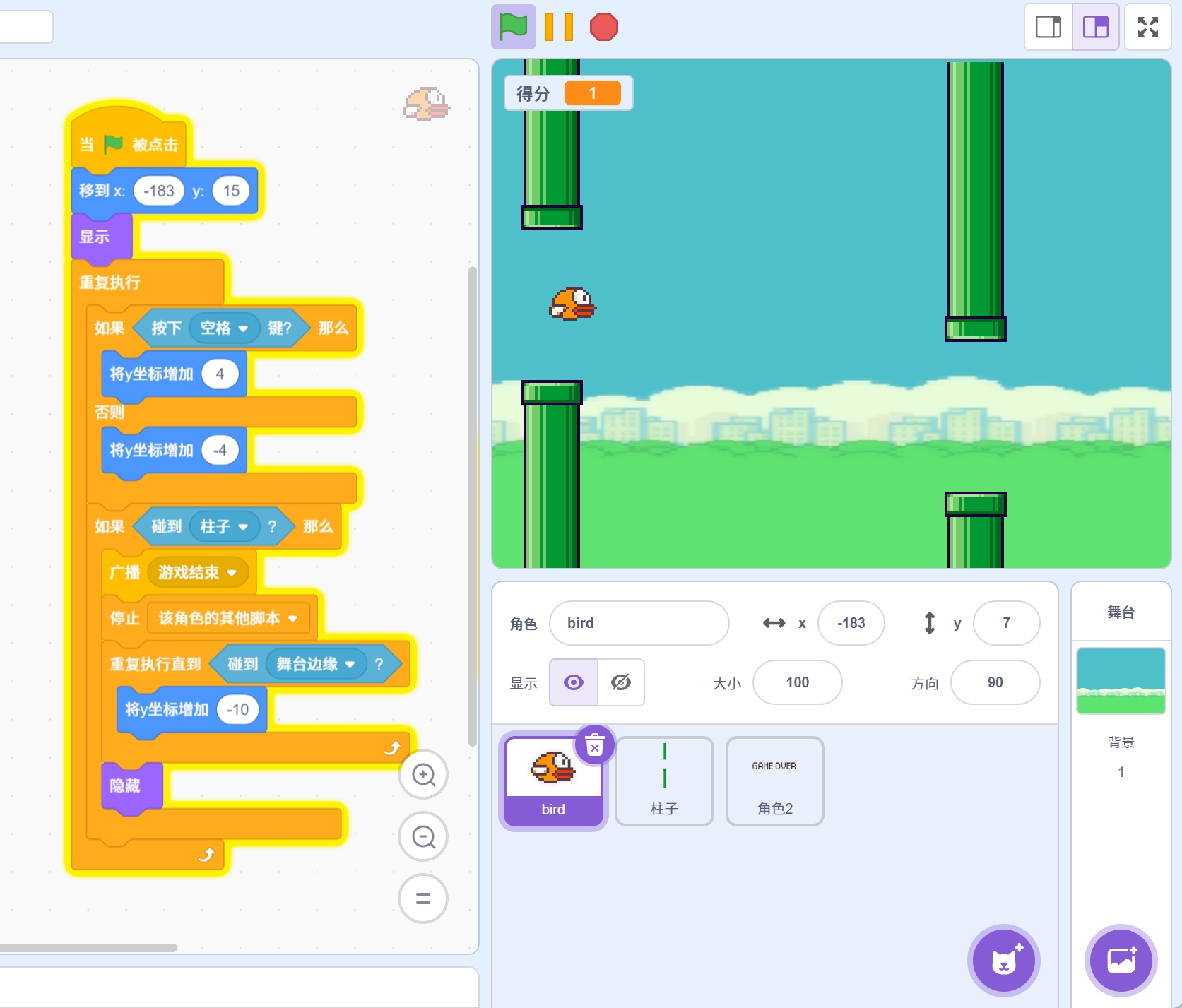 《像素小鸟》是一款基于Scratch的经典像素风飞行闯关游戏,玩家需要操控小鸟穿越障碍,挑战更高分数!🏅🏆