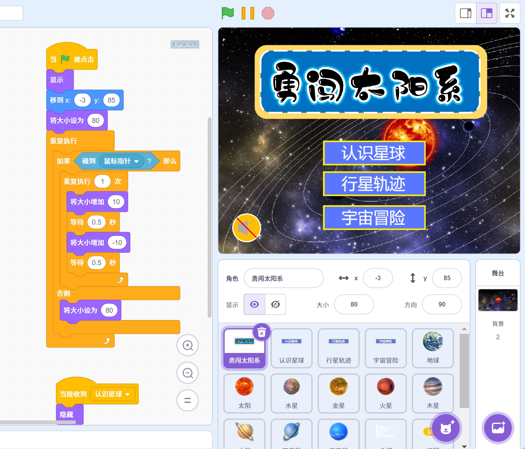 《勇闯太阳系》是一款基于Scratch的互动式科普游戏, 旨在帮助玩家探索太阳系八大行星,观察其运行轨迹,并通过答题积分的方式激发学习兴趣!🌞🪐✨