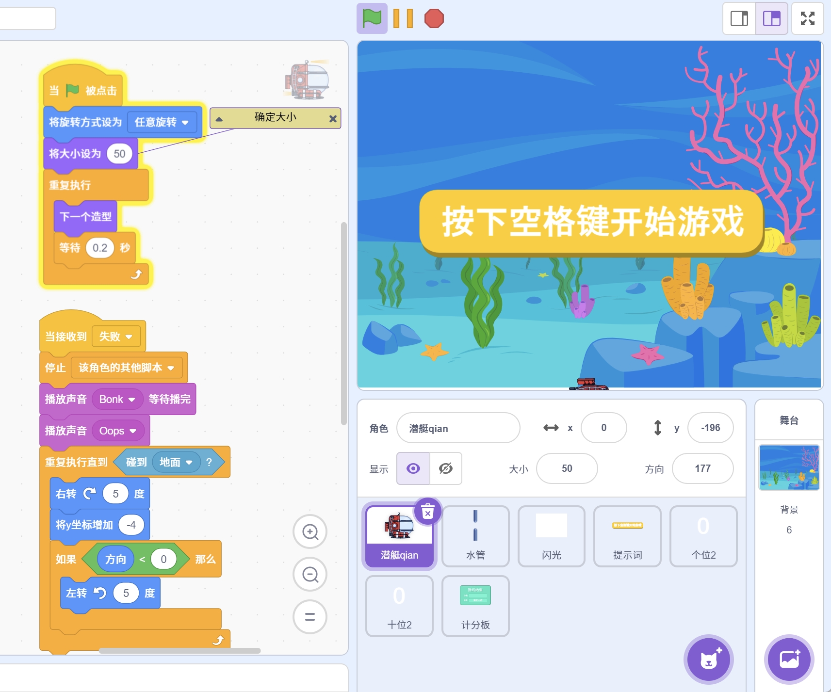 本作品是一个 基于Scratch开发的互动潜艇躲避游戏,使用摄像头侦测玩家的运动,实现角色的上升与下降,通过巧妙操控潜艇,挑战高分!⚓