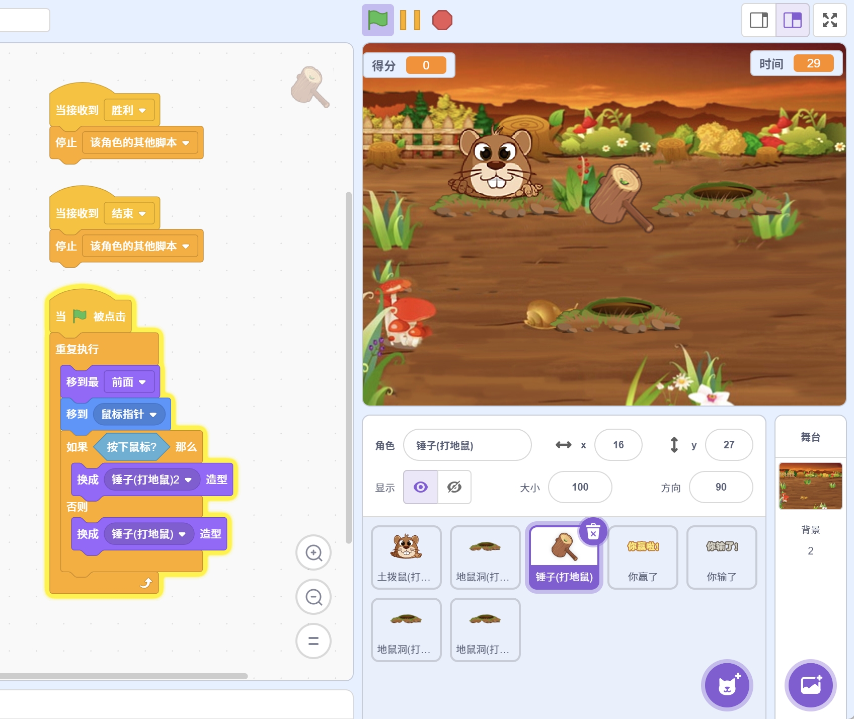 经典打地鼠游戏的Scratch复刻版!地鼠会从不同地洞随机钻出,玩家需用锤子快速击打来获得分数,挑战你的反应速度极限。
