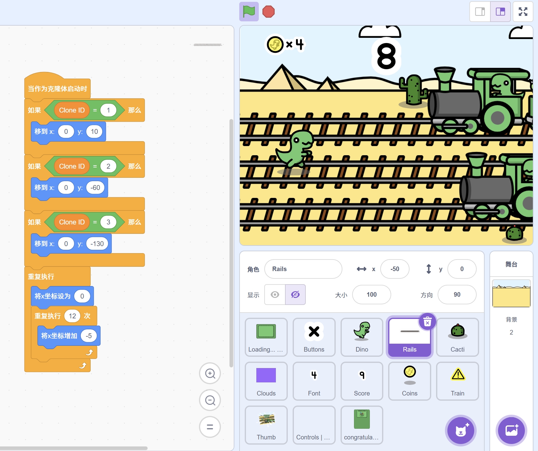 帮助小恐龙穿越沙漠,躲避疾驰的火车并收集硬币以解锁新皮肤!这是一款灵感来源于 Chrome 恐龙游戏的 Scratch 作品,支持 PC 和移动设备操作,拥有计时模式和高分挑战,适合所有玩家体验。