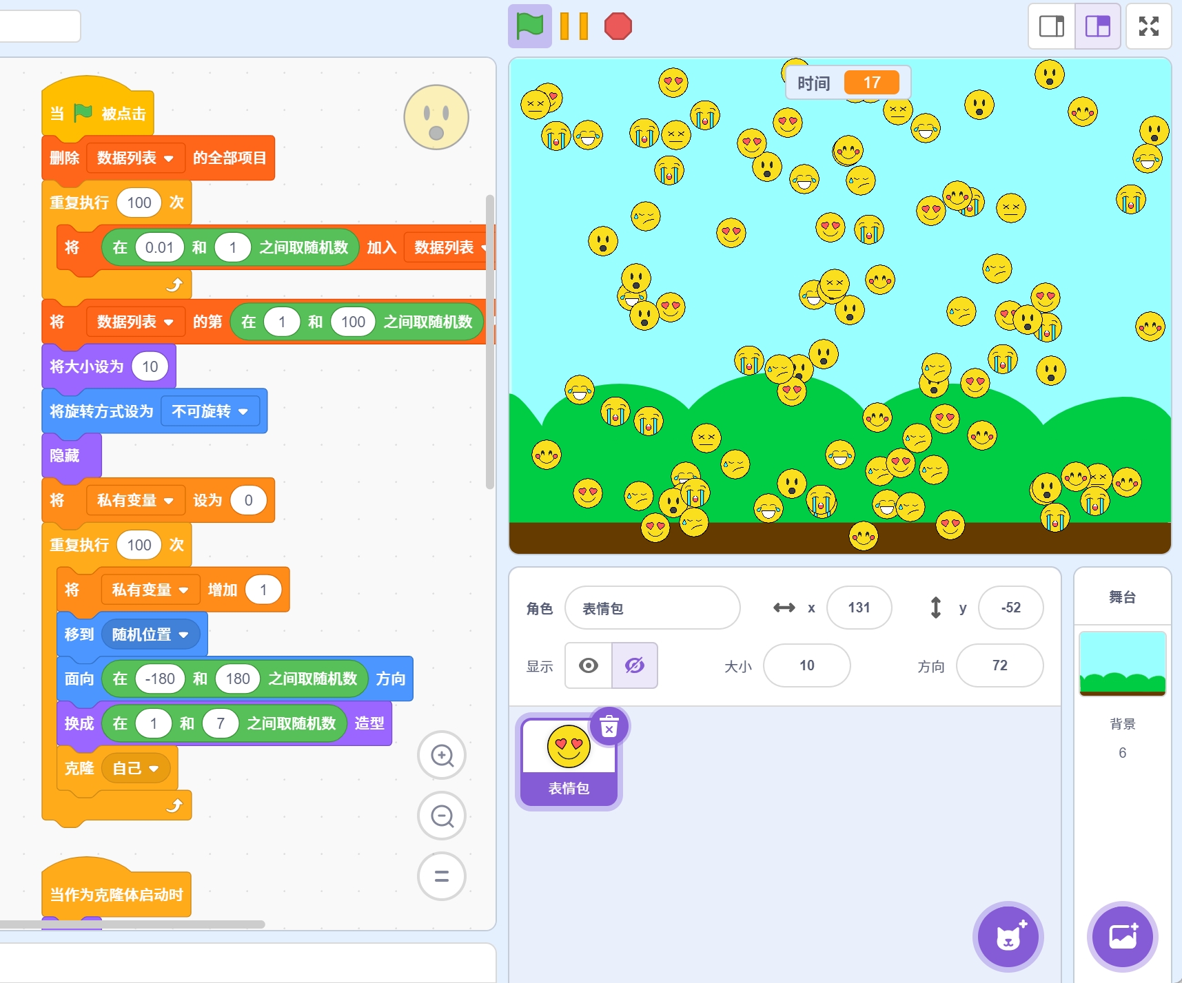 《寻找不动的表情》是一款考验眼力和反应速度的趣味游戏!点击小绿旗后,舞台区会出现许多移动的 emoji 表情,但只有一个表情是静止不动的。你的任务是在最短时间内找到这个不动的表情,并用鼠标左键点击它。快来挑战你的观察力和反应力吧!