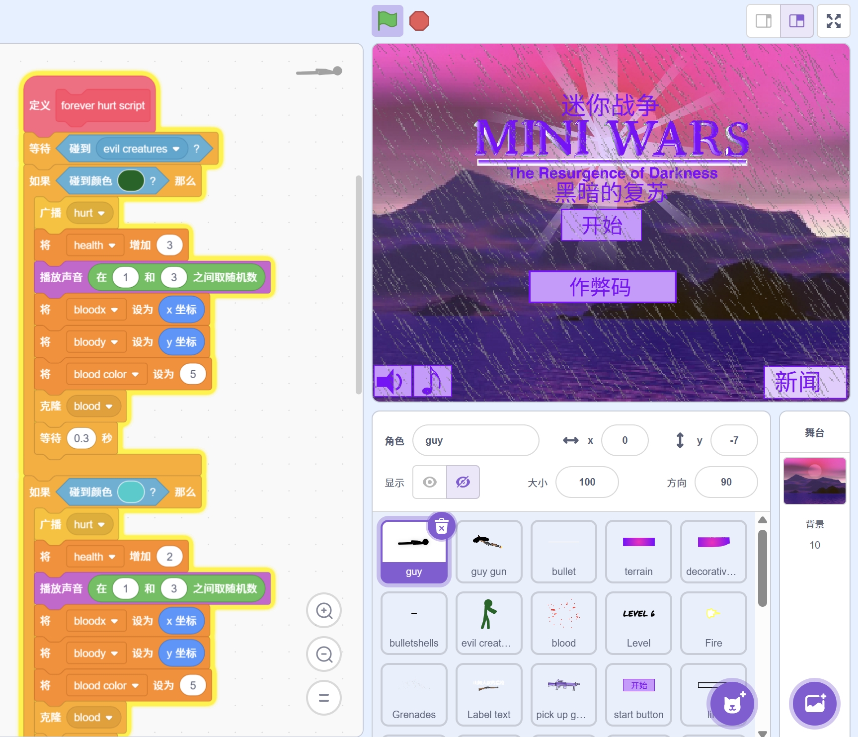 《迷你战争:黑暗复兴》是一款暗黑风格的双摇杆射击游戏!玩家将扮演末世的幸存者,在废墟与迷雾中对抗变异生物与敌对势力。游戏以 武器库自由切换 和 隐藏代码奖励 为核心亮点,结合快节奏战斗与策略选择,打造Scratch平台罕见的硬核射击体验。