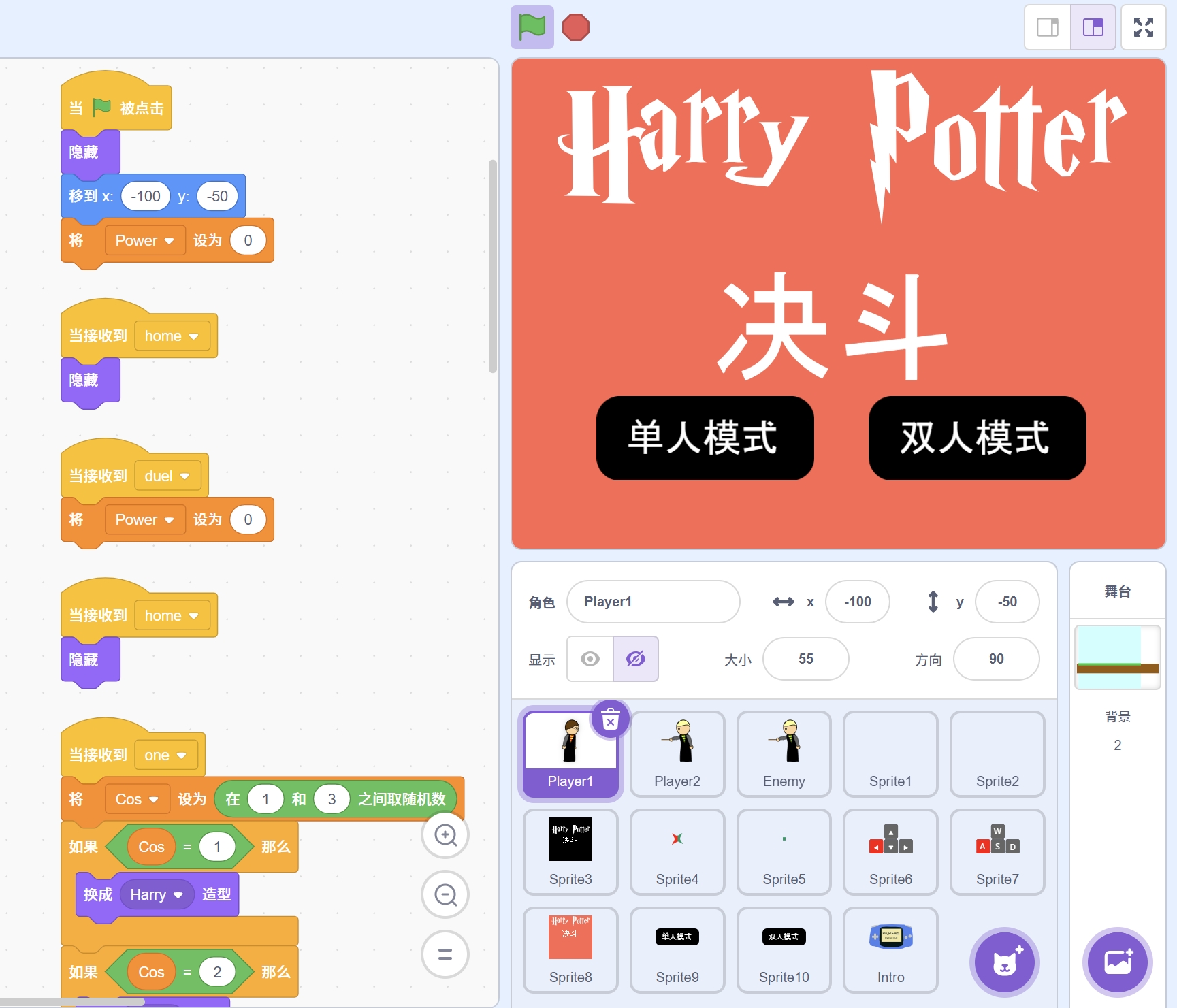 基于《哈利·波特》IP的实时对抗游戏!玩家可选择 单人战役(正派三杰 vs 食死徒军团)或 双人PK(WASD操控正派 / 方向键操控反派),通过快速反应按键触发咒语连击,重现霍格沃茨史诗级对决!