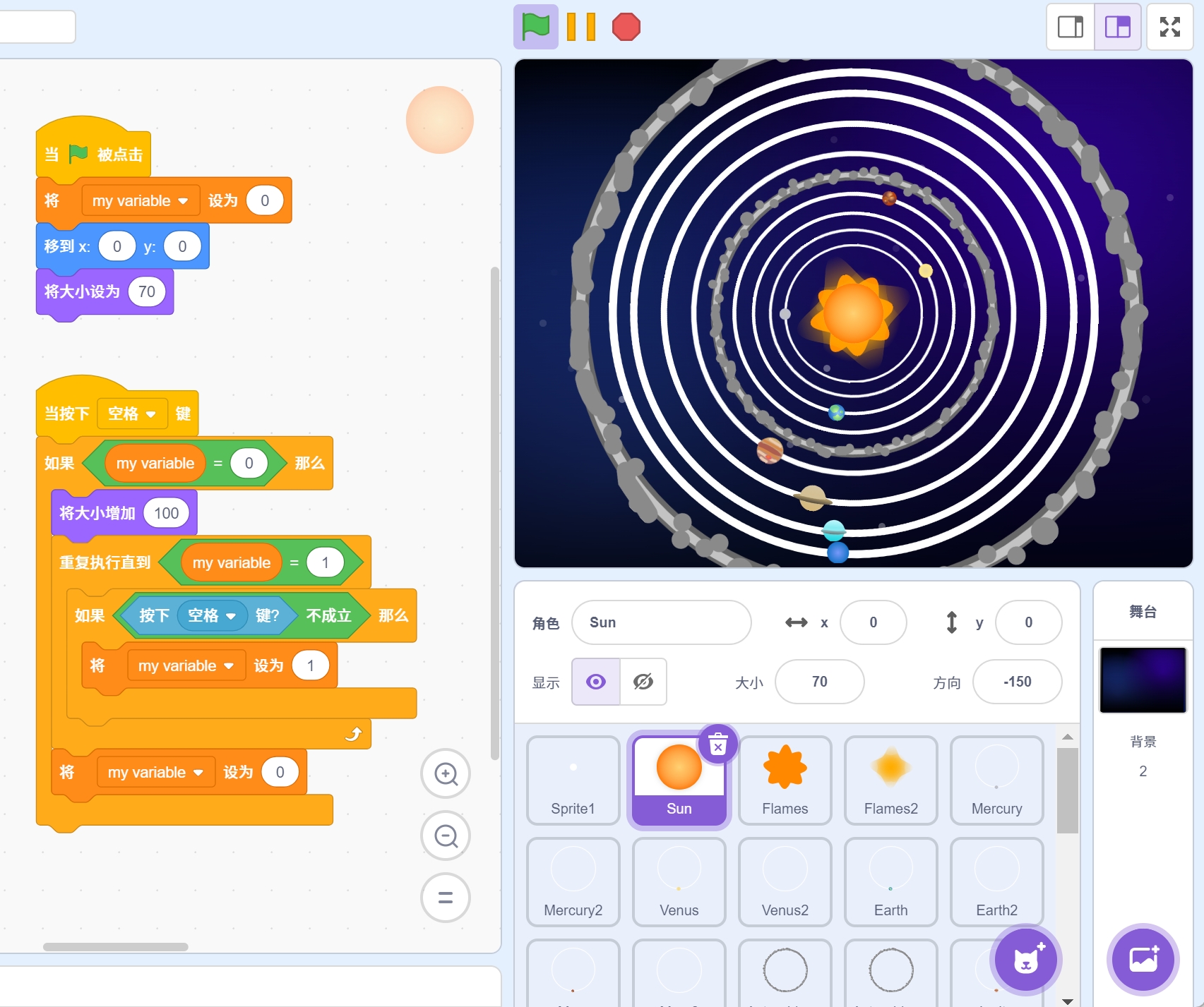 《太阳系模拟器》是一款Scratch天文教育互动作品,真实还原太阳系行星运行轨迹。观察行星公转、点击探索迷你游戏,还能实时计算地球年数!