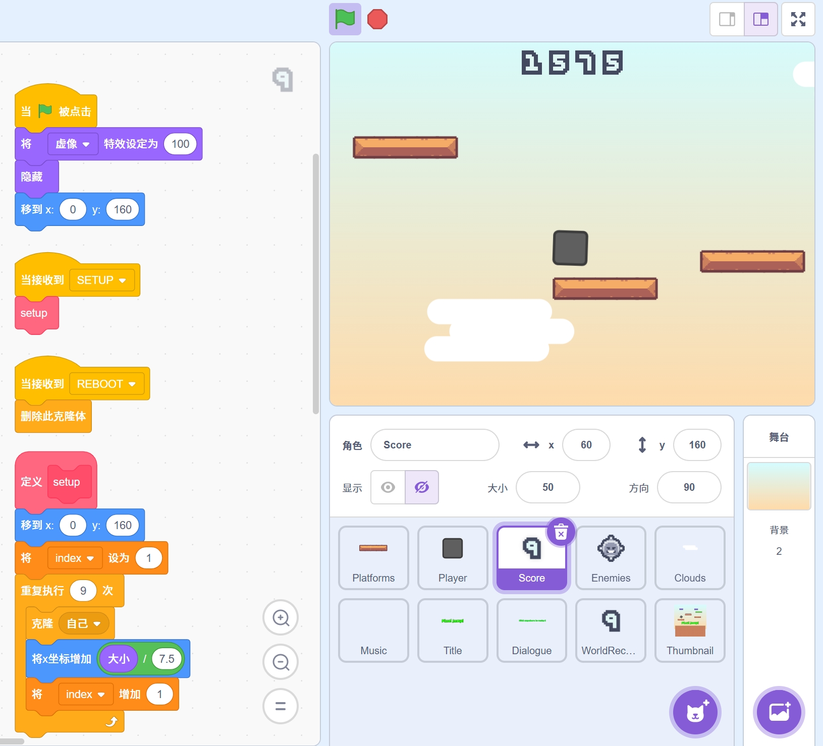 作者cs2889410 游戏说明: 将鼠标移动到您想移动的区域 点击/轻触实现二段跳!!! 在平台上跳跃可弹得更高 避开锯齿怪物和尖刺平台 挑战极限高度,难度会越来越高! 预览 版权说明:资源均源于互联网收集整理,不保证资源的可用及完整性,仅供个人学习研究,请勿商用。喜欢记得支持正版,若侵犯第三方权益,请及时联系站长删除!
