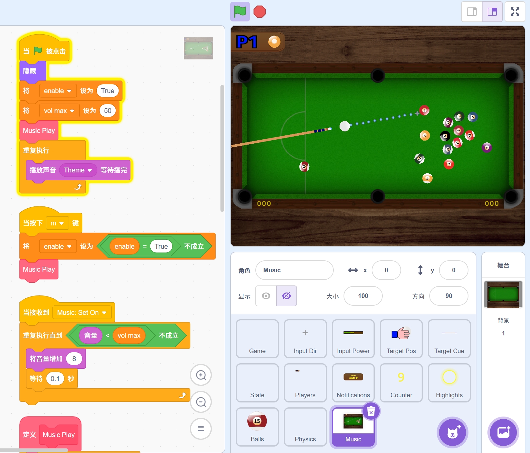 双人台球游戏。移动鼠标调整方向,点击并按住鼠标设置击球力度。