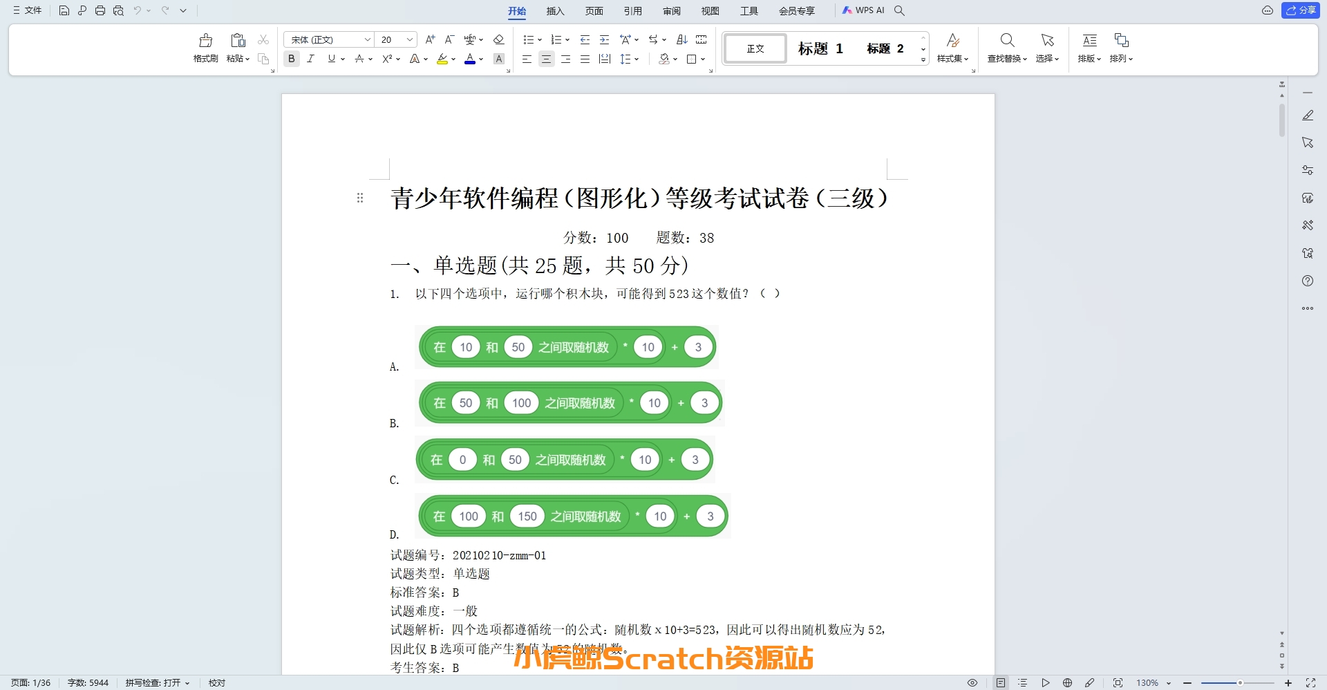 2022年3月青少年软件编程(图形化)等级考试试卷三级(含答案) 版权说明:资源均源于互联网收集整理,不保证资源的可用及完整性,仅供个人学习研究,请勿商用。喜欢记得支持正版,若侵犯第三方权益,请及时联系站长删除!