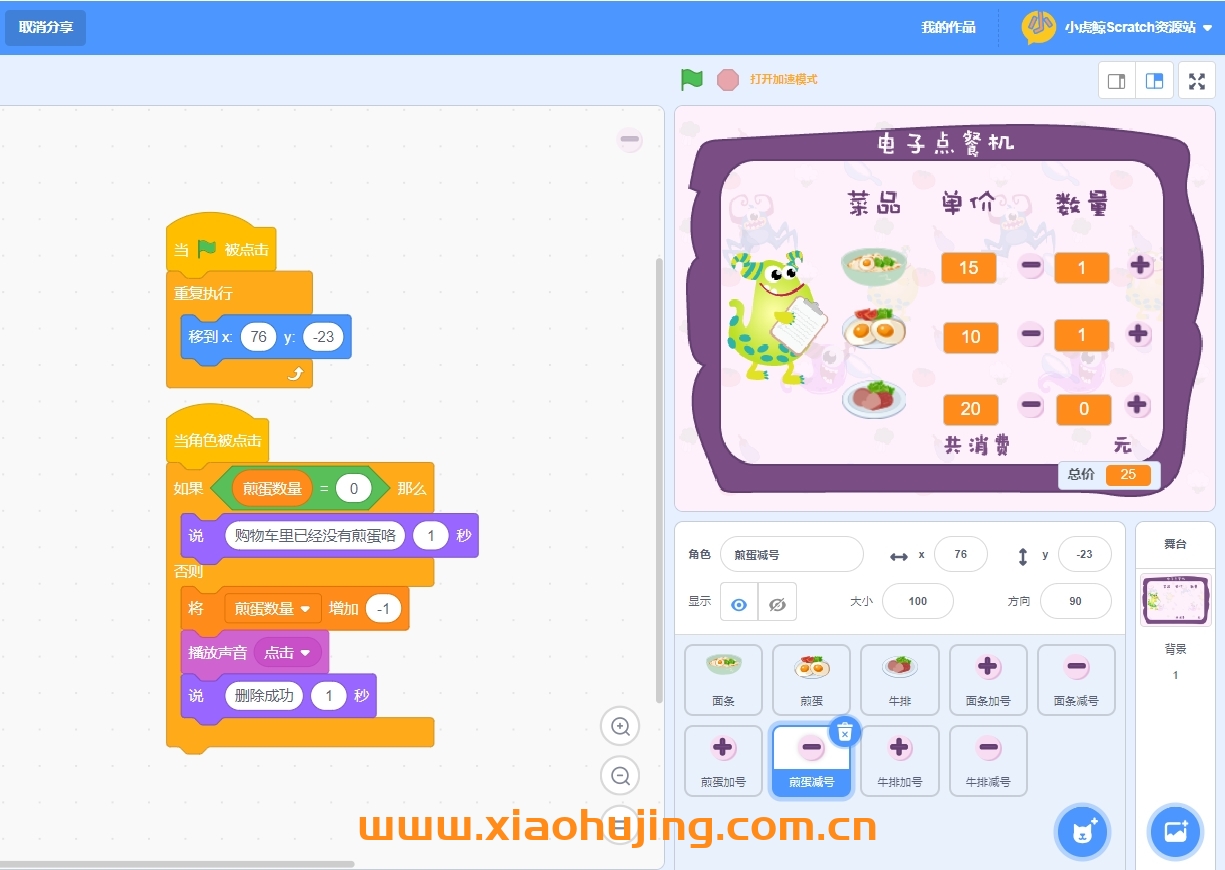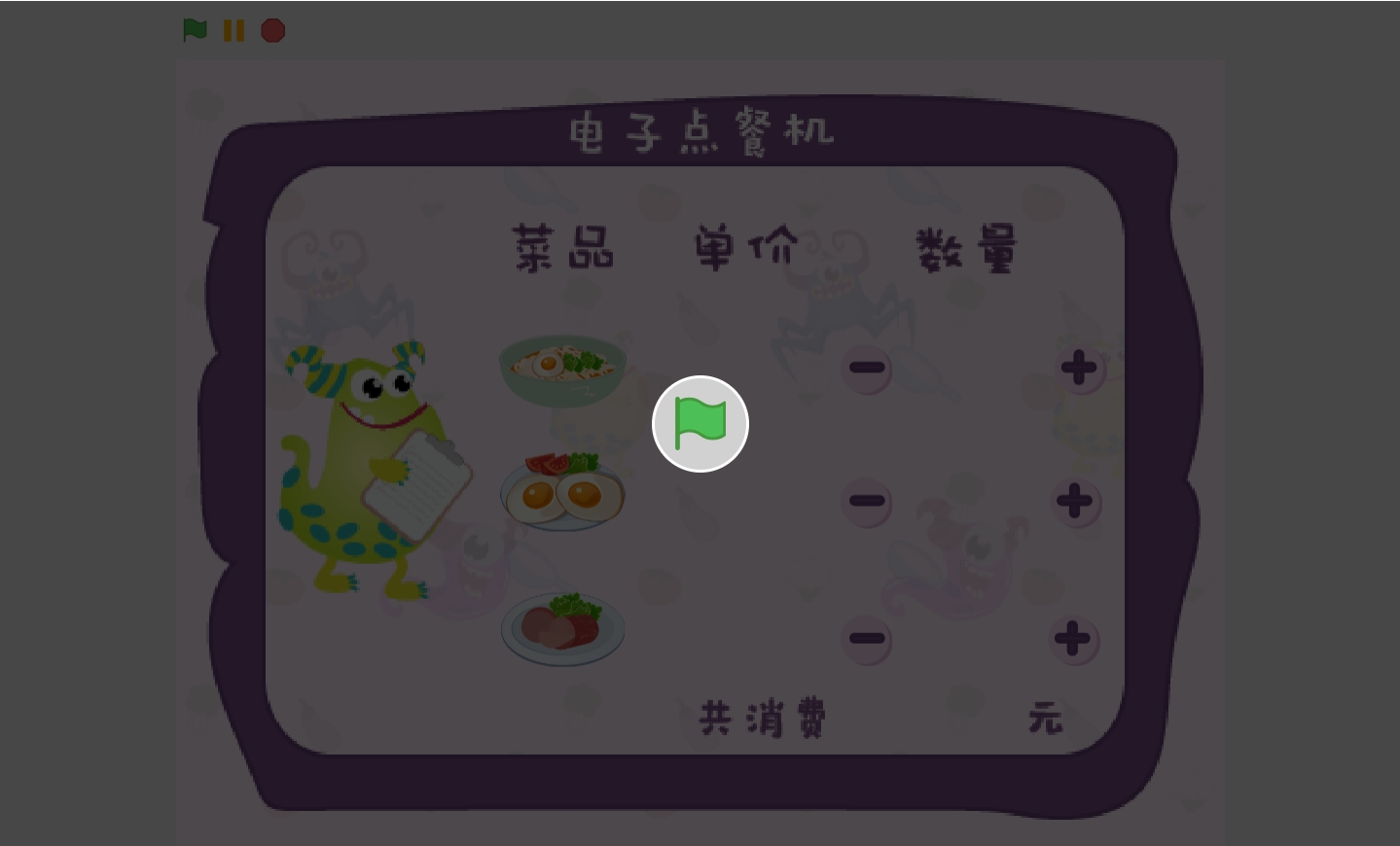 《电子点餐机》是一个基于Scratch平台开发的入门级小程序,该程序模拟了一个简易的电子点餐机界面。在点餐机上,展示了三种不同的食品:面条、煎蛋和牛排,每种食品后面都分别标注了单价和数量。用户可以通过点击每种食品旁边的加号或减号来修改点餐的数量,点餐机会根据所选食品的数量和单价自动计算出总价格。