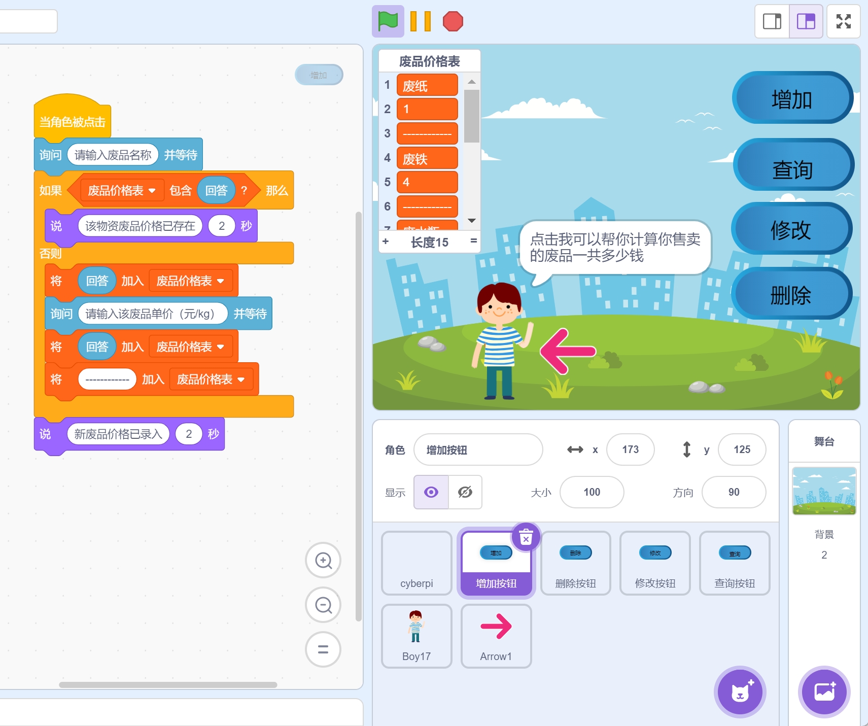 在这款作品中,你将学习如何操作废品回收系统,包括废品的增、删、改、查等功能。通过模拟回收废品,你可以了解环保回收的过程,同时掌握列表操作的基本技能。