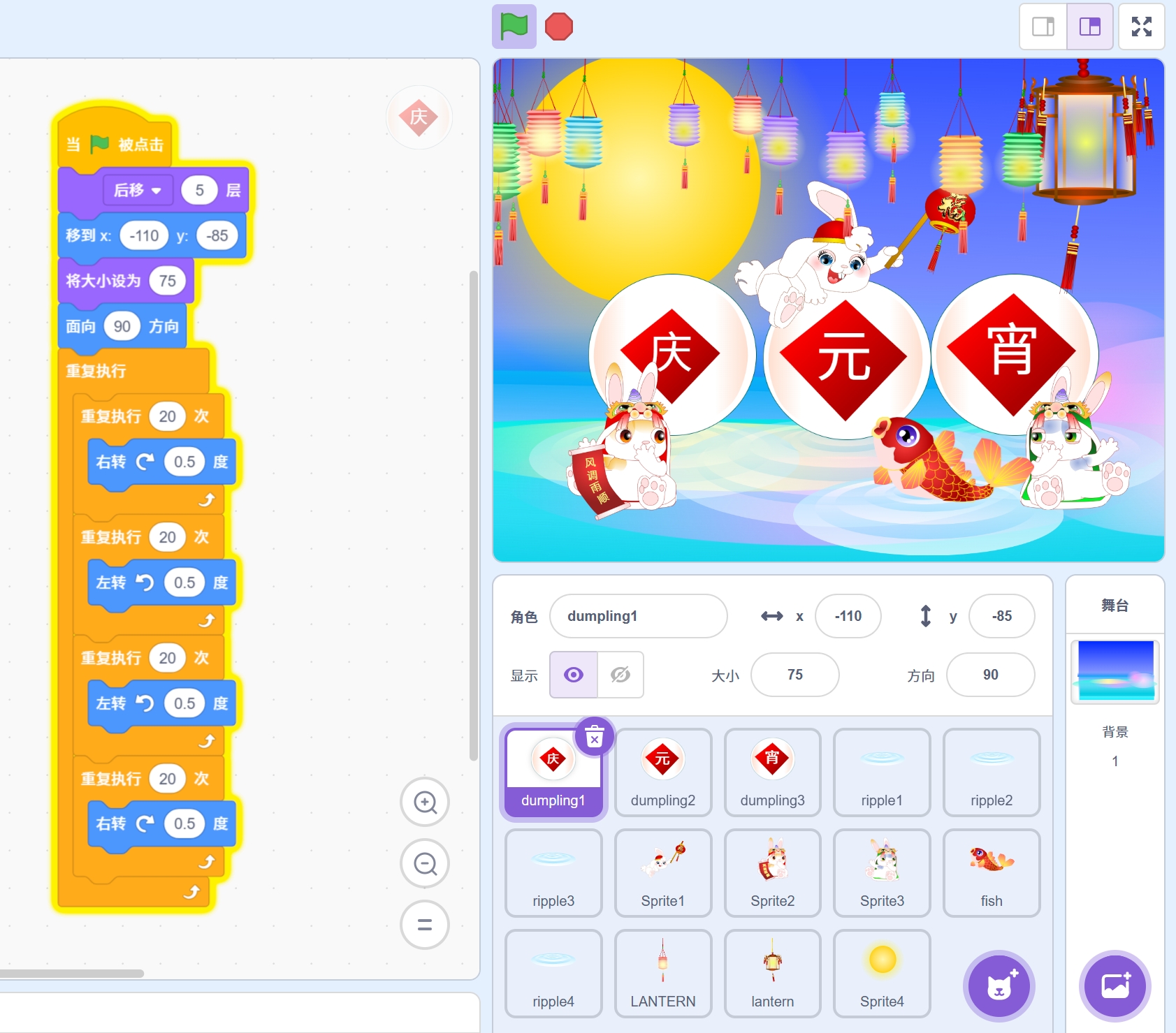 《元宵》是一款以中国传统元宵节为主题的Scratch动画作品,旨在用数字艺术重现节日的温馨氛围。点击绿旗,开启一场视觉与文化的盛宴,感受灯笼高挂的节日盛景!